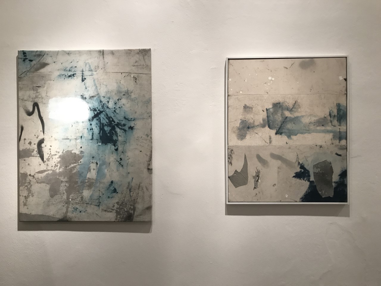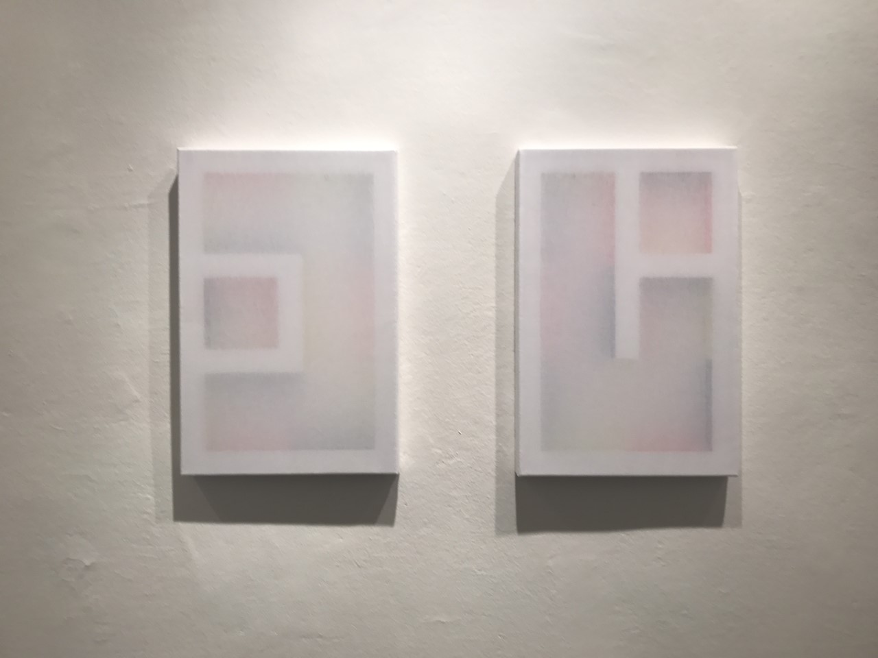 Questi tre giovani, davvero promettenti, ricercano nella loro pittura la sintesi dell’astrazione e la componente materica delle opere informali, attraverso un uso del colore tenue e delicato. I toni pastello sono i protagonisti e, appena accennati, emergono dal candore degli sfondi. Le opere giocano sull’abbinamento di diversi materiali, come accade nei lavori di Struan Teague (Edimburgo, 1991) dove su tele grezze o cucite sono accostati gesso, olio, polvere, sporco alla pittura. La sua ricerca dimentica la forma delle cose e ne restituisce l’essenza, sulla tela tutto può essere rimescolato e utilizzato per creare l’opera: il disordine iniziale si trasforma in equilibrio.