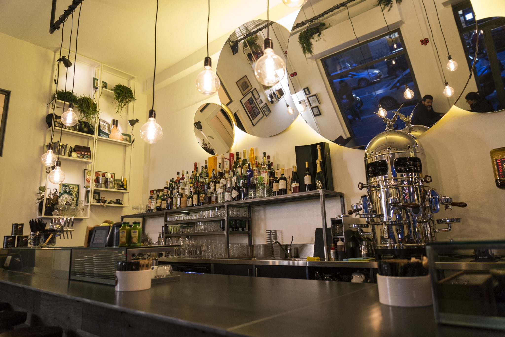 E’ un locale camaleontico, con vetrine che si spostano e delineano il momento colazione/pranzo da quello più importante dell’aperitivo/cena. Tutti gli accessori ricordano il magico periodo dagli anni ’30 ai ’60: bicchieri brandizzati ottenuti da fondi di bottiglia, insegne originali del locale portate a nuova luce (fu una macelleria negli anni ’50 e una rivendita di olii, vini e liquori negli anni ’60), l’imponente macchina del caffè, vinili sulle mensole delle pareti, la pagella di uno studente del 1932, le prime pubblicità anni ’40, le scritte nei bagni e i dettagli vintage, vecchi titoli bancari americani, infine le proiezioni in bianco e nero di film cult dei primi anni ’70.