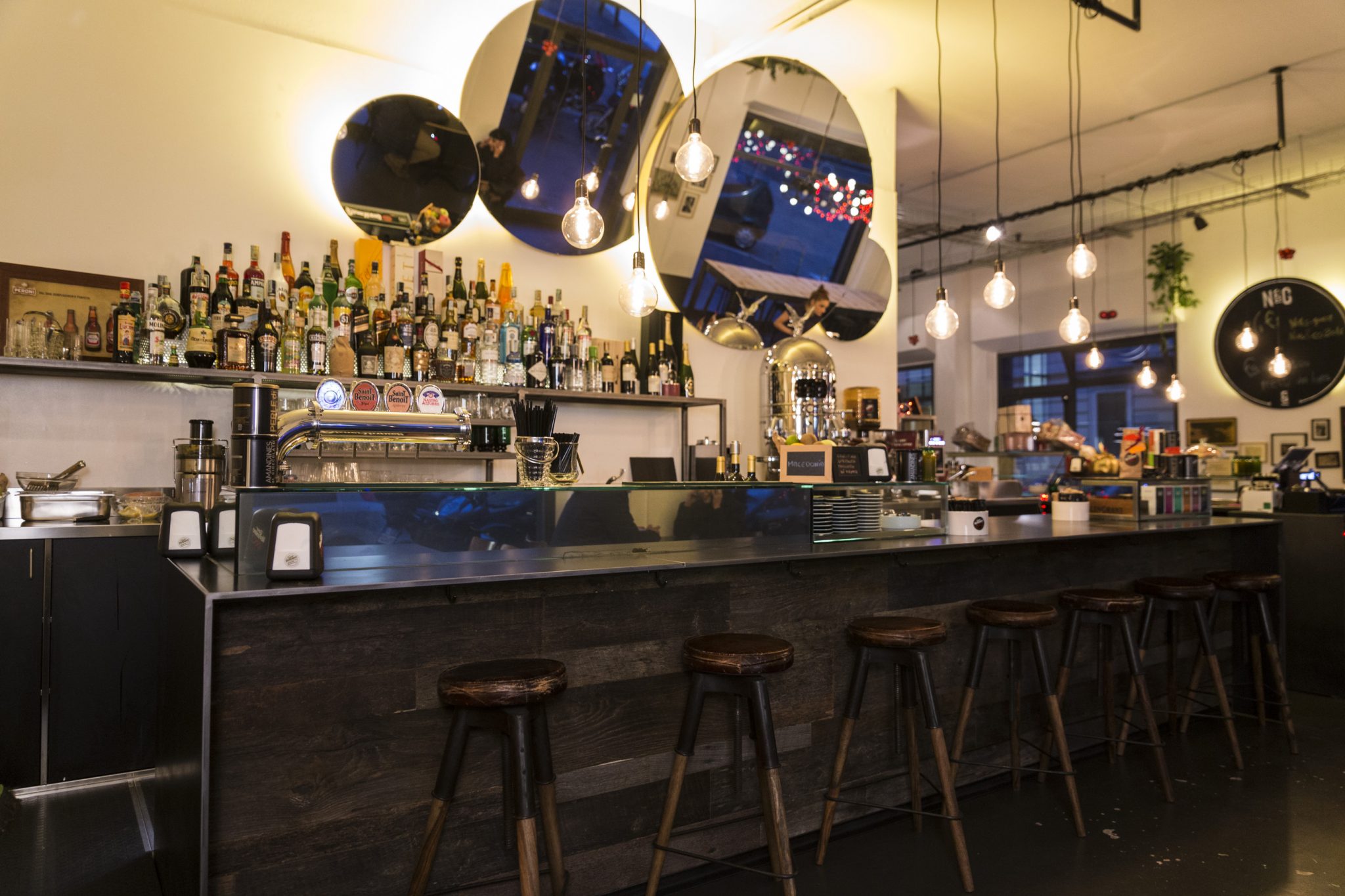 La luminaria che si scorge all’ingresso delle ampie vetrate è realizzata con l’anima in ferro di un pilastro originale degli anni ’50 e due ampi tavoli social in legno dove poter incontrare menti creative ed ottima compagnia. Al Nik’s, in puro stile di condivisione di spazi, pensieri e idee, si può lavorare con rete wi-fi free, incontrare i clienti e condividere i progetti davanti ad un buon caffè: lo spazio ideale per i freelance in cerca di un ufficio. Il locale di 120mq consta di 60 posti a sedere, che arrivano a 110 con il dehor esterno, accompagnati da musica rigorosamente swing o jazz intervallata da esibizioni live.