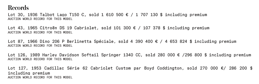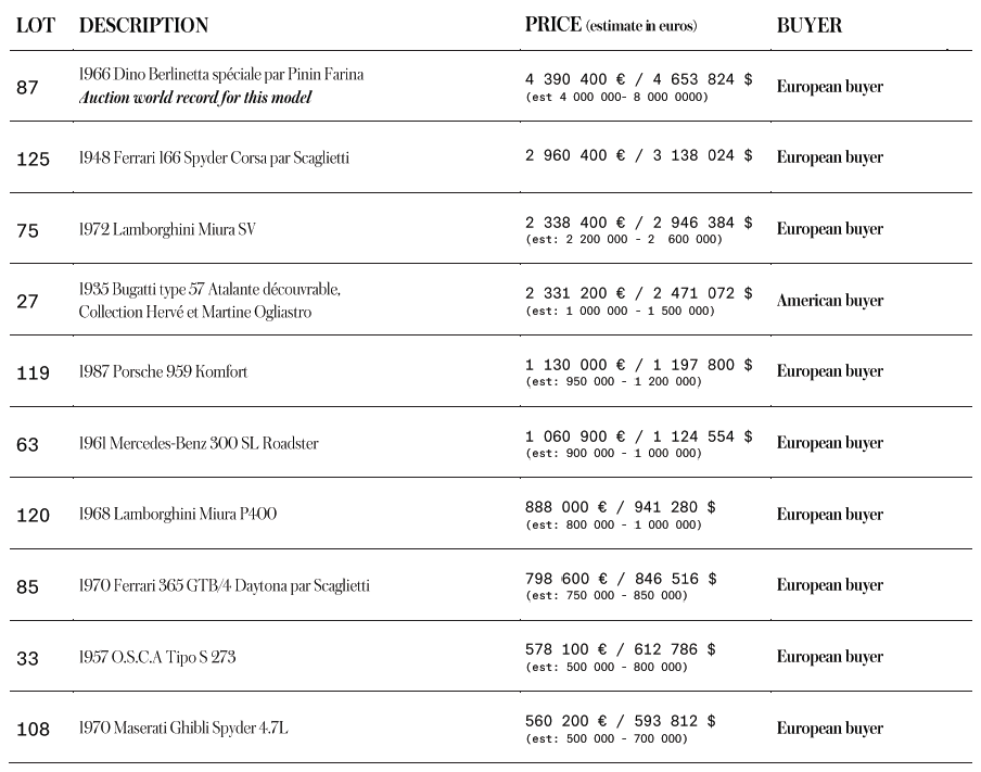Tutti i modelli in vendita sono stati prodotti tra il 1901 e il 1967. Il risultato della vendita ha visto una crescita di circa il 32% in più rispetto al 2016 e 7 vetture hanno superato il milione di euro, il che costituisce un importante record. Tra i pezzi in asta, i più interessanti la Ferrari Dino del 1965, il primo prototipo di Dino mai prodotta da Pininfarina, che è servita da base per l’elaborazione di tutti i successivi modelli da corsa a 2 sedili. Un pezzo fondamentale della storia di Ferrari, venduta a un collezionista europeo per 4.390.400€. La collezione del rocker francese Johnny Hallyday (battuta a scopi benefici), era composta da un’Harley Davidson e una Cadillac, entrambe apparse nel video di “Allumer le Feu”. I due pezzi sono stati venduti per 550.000€. Infine si segnala la Ferrari da corsa Scaglietti del 1948, battuta a 2.960.400€