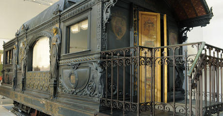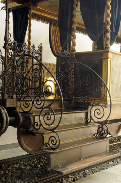 Qui è possibile ammirare, in tutto il suo splendore, l’insieme dei tre vagoni: il primo è una vera e propria balconata delle benedizioni con colonnine tortili dorate, un fregio vegetale, fiori di rame cesellato con al centro le armi pontifice, un interno tutto velluti e una volta in finto velario cosparsa di stelle.