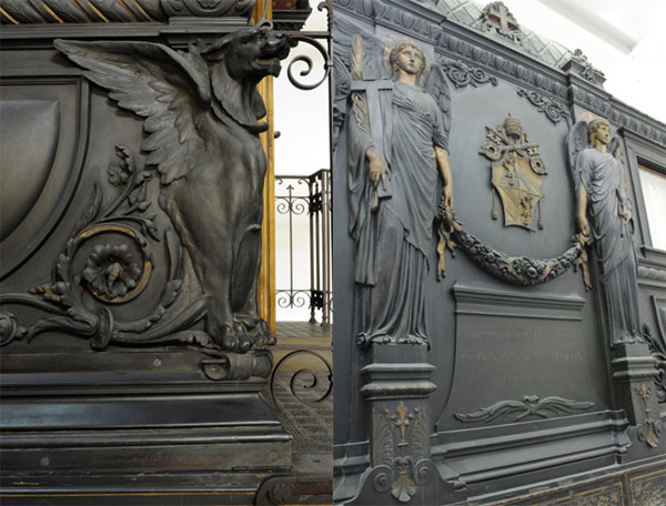 Il terzo e ultimo, progettato da Emile Trelat – professore dell’Imperiale Conservatorio parigino di arti e mestieri – e realizzato dalla Compagnie Gènèrale de Matèrièls des Chemins de Fer di Parigi nello stabilimento di Clichy, è di fatto una lussuosissima cappella. L’esterno è stato rivestito in rame argentato e dorato da Christofle mentre i rilievi e le sculture sono opera di Godin. A lui si devono, inoltre, i tre angeli per parte – caratterizzati dagli attributi che contraddistinguono le Virtù Teologali: Fede, Speranza e Carità – e i quattro grifoni agli angoli. L’interno, invece, è decorato da fregi e dipinti firmati da Cambon e Gerôme. Quest’ultimo è anche l’autore dei ritratti su rame raffiguranti “La Vergine Con Bambino” e “Il Buon Pastore”, un tempo appesi nell’ambiente principale della cappella e ora esposti nella sala.