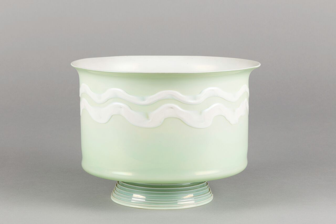 Coppa cilindrica con collo svasato e piede troncoconico in sottile vetro incamiciato con applicazioni ad onda e filamenti sulla base in vetro lattimo. Superficie iridata.