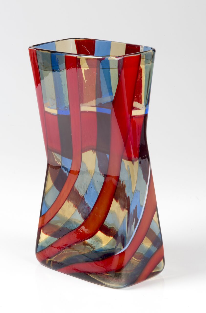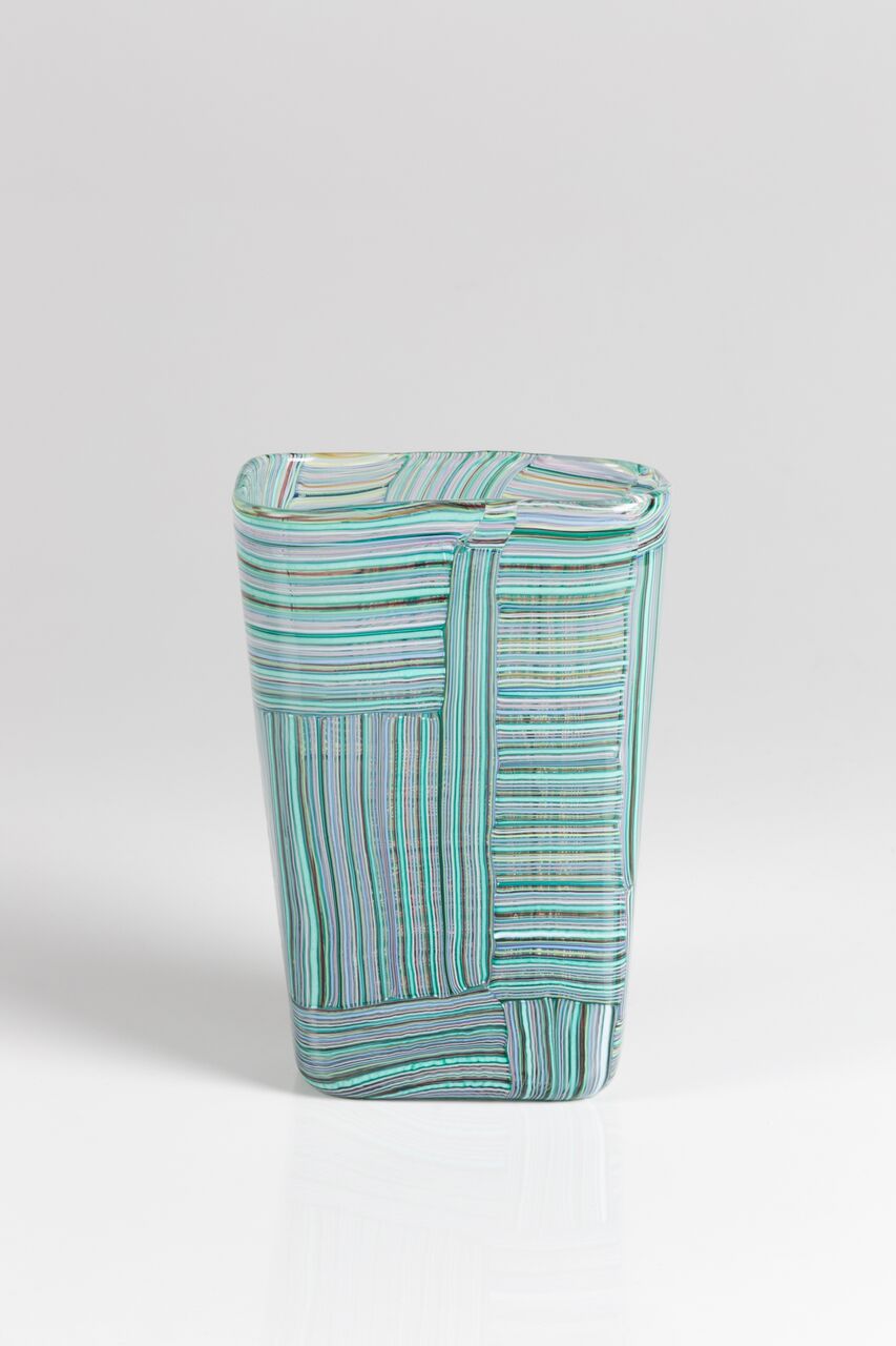 Vaso troncopiramidale in vetro soffiato formato da tessere costituite da sottile canne policrome.