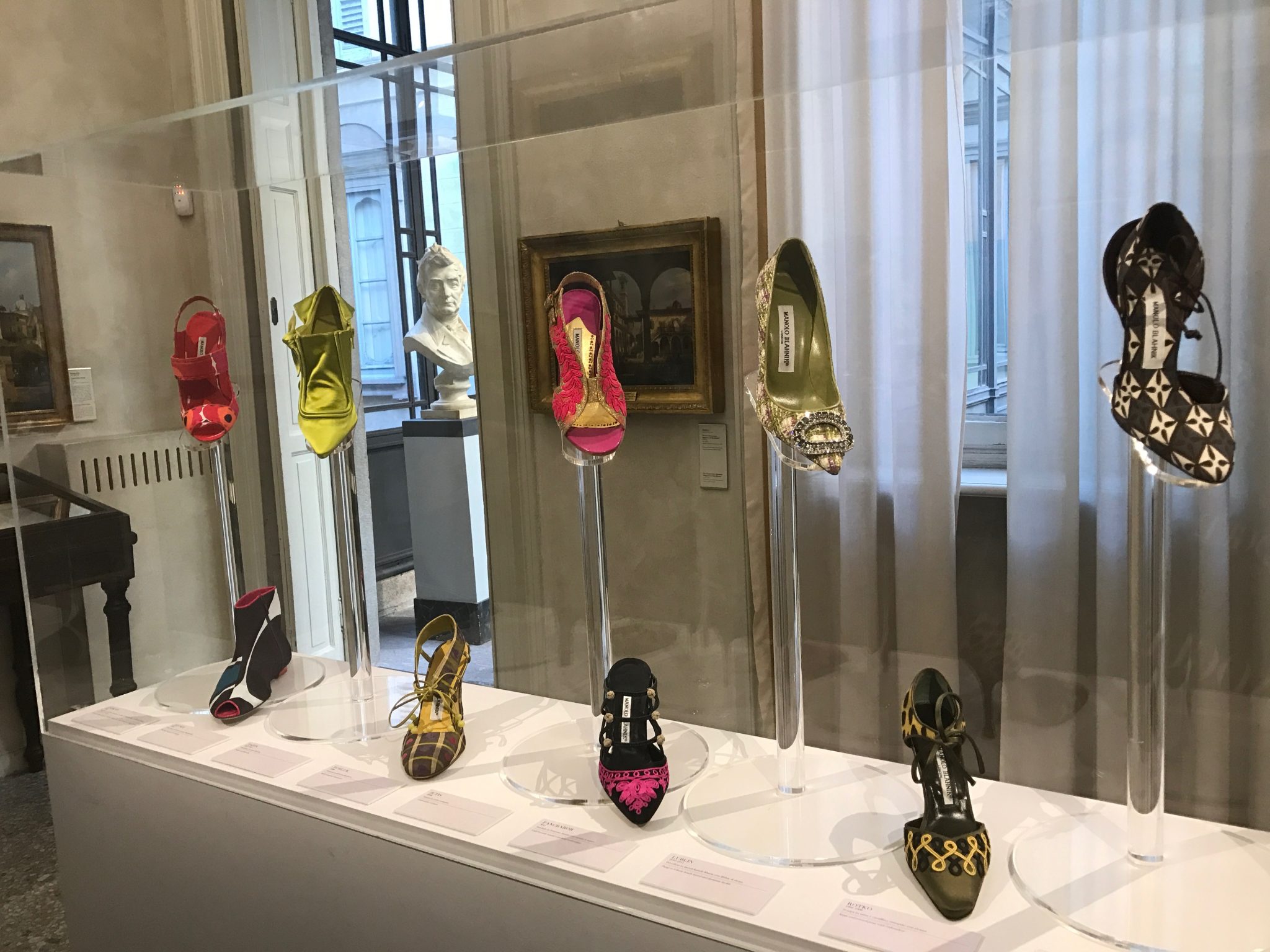 Proprio per questo poter vedere le sue scarpe esposte in teche all’interno delle stanze di palazzo Morando, incastonate in meravigliose quadrerie ottocentesche, è incredibilmente suggestivo. L’ibridazione fra l’arte e la moda è elevatissima, Manolo annulla ogni distinzione, le sue scarpe infatti rappresentano un perfetto intreccio tra moda, arte e cultura, in particolare quella italiana. Manolo è il primo a dichiarare di essere da sempre una vittima dell’Italia, della sua gente, delle sue strade, dei suoi musei, dei suoi palazzi. L’esposizione intende proprio raccontare la profonda influenza che l’arte e la cultura italiana hanno avuto e hanno ancora oggi sullo stile di Manolo. Dalla scultura greco-romana al barocco, dal capolavoro di Luchino Visconti – Il Gattopardo – ai coralli di Sicilia. Anche la Natura è fonte di ispirazione per lo stilista, e così nei suoi disegni spesso vi sono numerosi riferimenti al mondo botanico, anzi tutto è iniziato da lì, quando Diana Vreeland notò una caviglia avviluppata in edera e ciliegie tra i bozzetti delle scenografie disegnate da Manolo Blahnìk e, ammaliata, gli consigliò caldamente di dedicarsi solo a quello: disegnare scarpe.