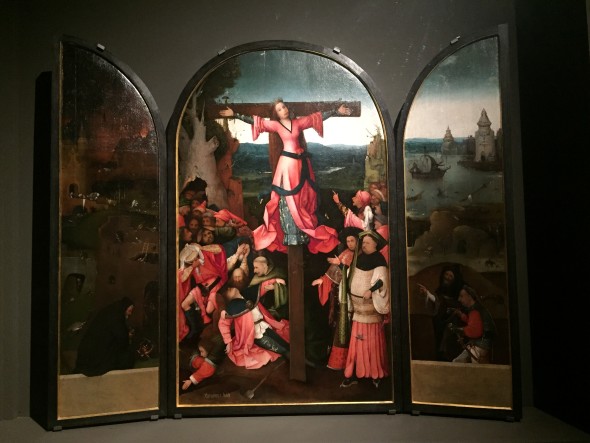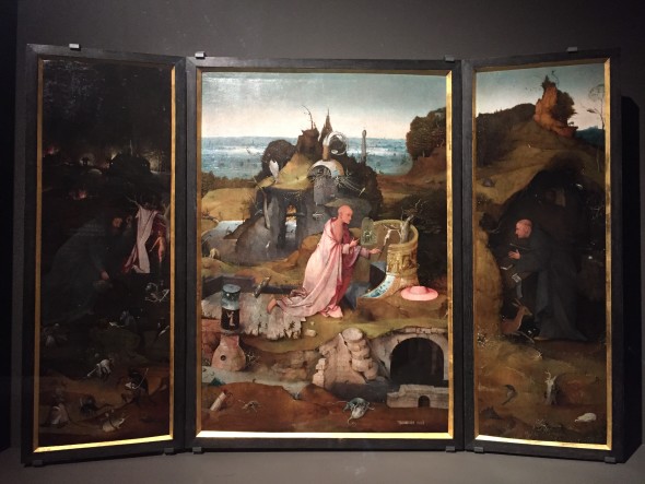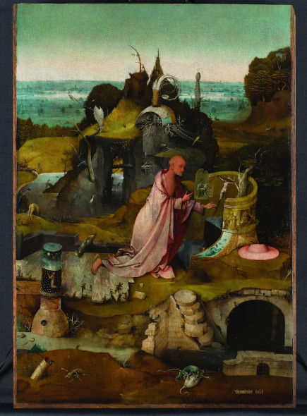 Attraversate le prime stanze con l’introduzione video del curatore dell’esposizione, Bernard Aikema, e una doppia timeline che mette in relazione fatti salienti della vita di Bosch con quanto accadeva nella Venezia di quel periodo, il visitatore incontra i trittici Tre santi eremiti e Martirio di santa Ontcommernis (Wilgefortis, Liberata). Entrambi autografi e realizzati da Bosch nella maturità, tra il 1495 e il 1505 circa, i dipinti sono accompagnati da riproduzioni delle analisi radiografiche che sono state effettuate di recente – assieme ad un accurato restauro conservativo – e che hanno rivelato nuove informazioni sulla genesi, l’evoluzione e il significato delle opere. Il gruppo di quattro tavole intitolate Paradiso e Inferno (Visioni dall’Aldilà) e datate tra il 1505 e il 1515, sono invece esposte nella sala successiva, assieme ad una piccola selezione di oggetti in bronzo del Cinquecento, raffiguranti satiri, dragoni e altri animali mostruosi, che arredavano gli studioli degli intellettuali del tempo di area veneta, a dimostrazione che la fortuna di Bosch e degli eredi del suo immaginario trova spiegazione nel fascino per il fantastico, il mostruoso e il grottesco, già diffuso nell’Italia settentrionale.