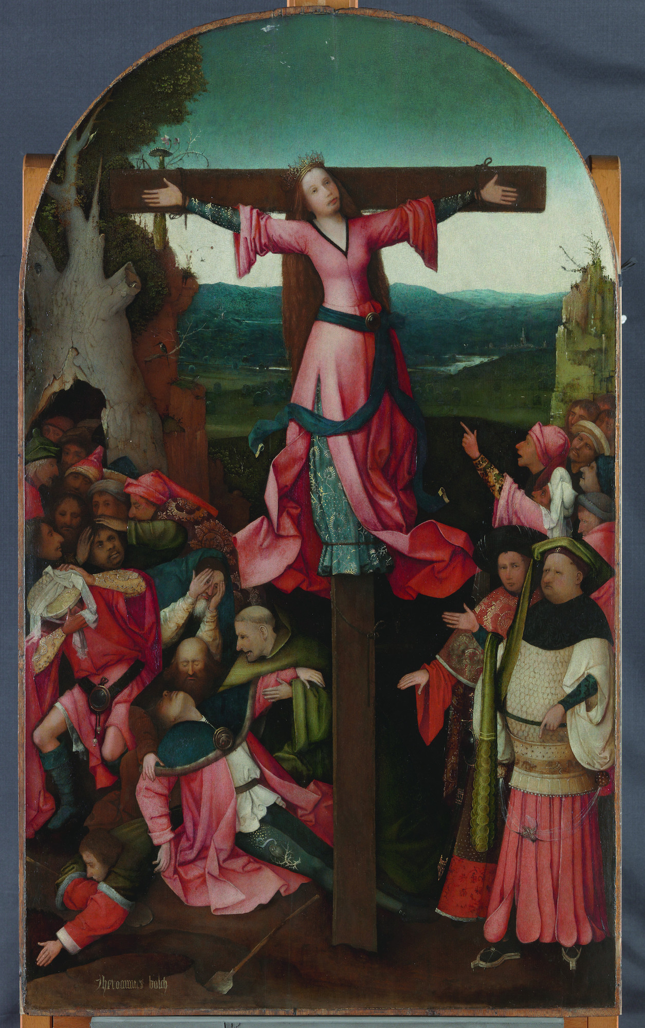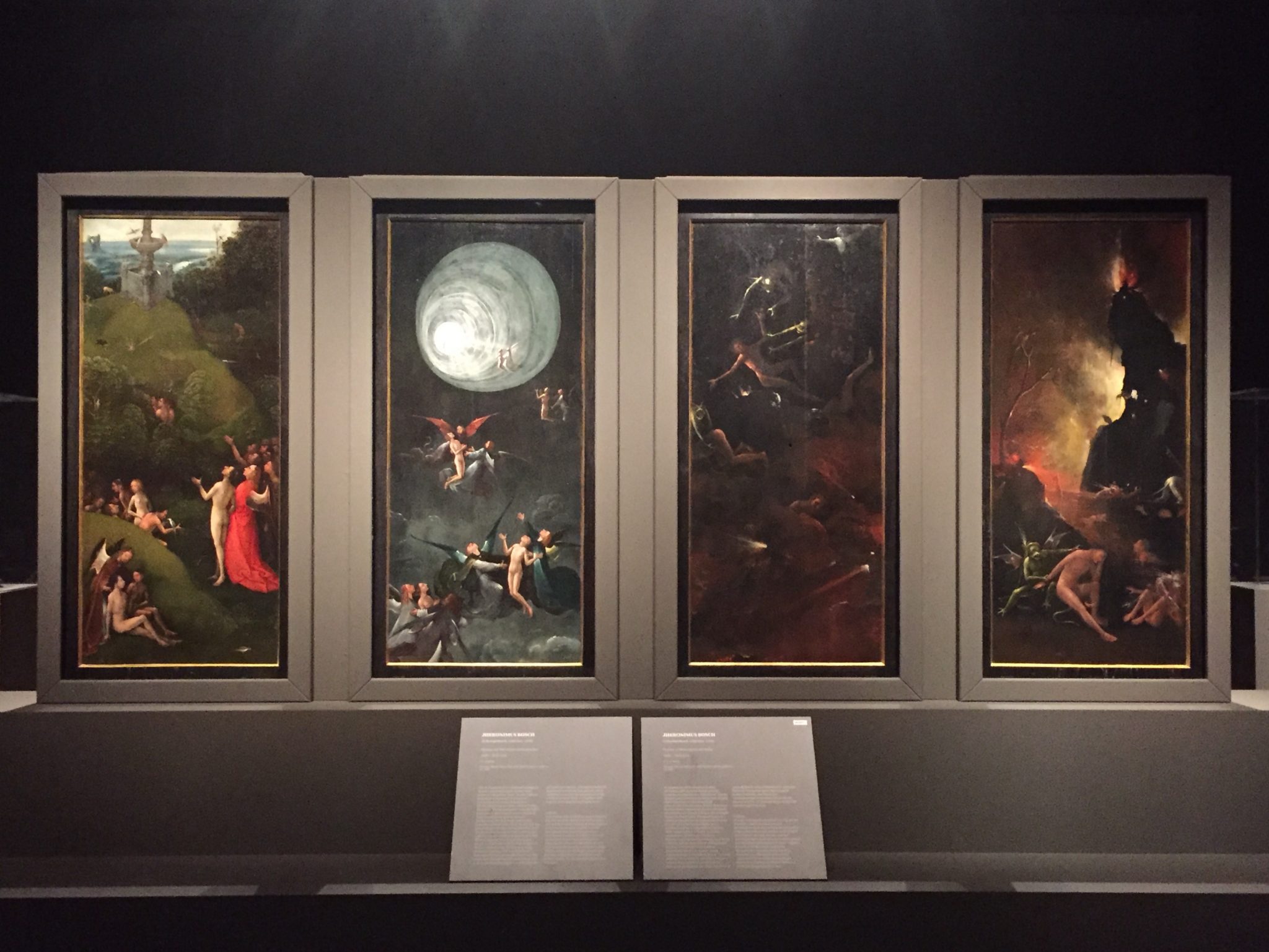 Attraversate le prime stanze con l’introduzione video del curatore dell’esposizione, Bernard Aikema, e una doppia timeline che mette in relazione fatti salienti della vita di Bosch con quanto accadeva nella Venezia di quel periodo, il visitatore incontra i trittici Tre santi eremiti e Martirio di santa Ontcommernis (Wilgefortis, Liberata). Entrambi autografi e realizzati da Bosch nella maturità, tra il 1495 e il 1505 circa, i dipinti sono accompagnati da riproduzioni delle analisi radiografiche che sono state effettuate di recente – assieme ad un accurato restauro conservativo – e che hanno rivelato nuove informazioni sulla genesi, l’evoluzione e il significato delle opere. Il gruppo di quattro tavole intitolate Paradiso e Inferno (Visioni dall’Aldilà) e datate tra il 1505 e il 1515, sono invece esposte nella sala successiva, assieme ad una piccola selezione di oggetti in bronzo del Cinquecento, raffiguranti satiri, dragoni e altri animali mostruosi, che arredavano gli studioli degli intellettuali del tempo di area veneta, a dimostrazione che la fortuna di Bosch e degli eredi del suo immaginario trova spiegazione nel fascino per il fantastico, il mostruoso e il grottesco, già diffuso nell’Italia settentrionale.