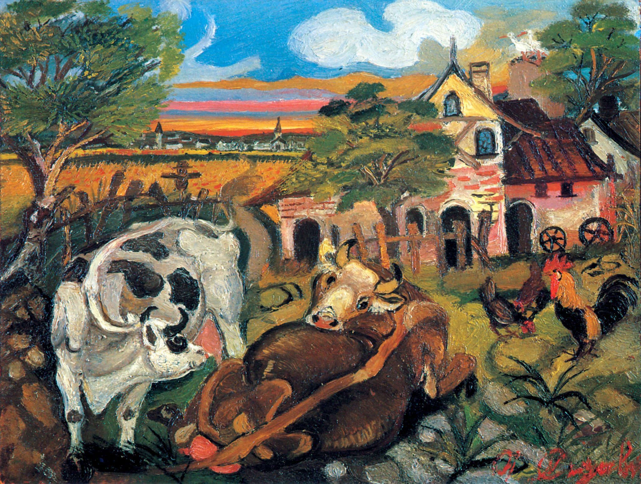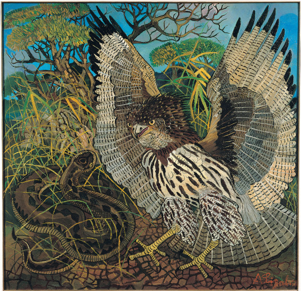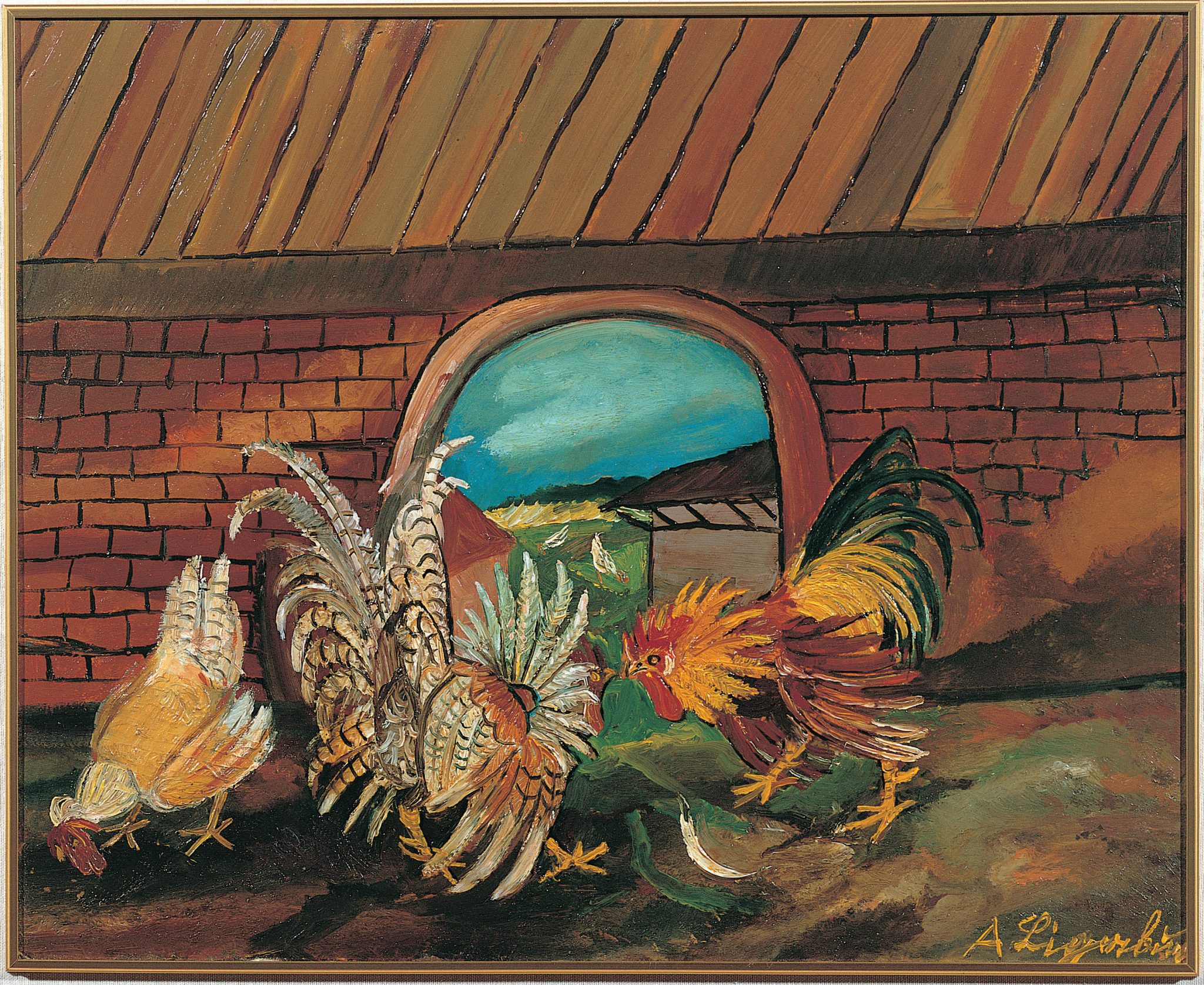 I soggetti prediletti: gli animali. Ligabue rappresenta gli animali domestici in un’atmosfera agreste, collocati in paesaggi che richiamano sia le terre piatte della Bassa reggiana –dove visse dal 1919 alla morte nel 1965– sia i castelli, le chiese, le guglie e le case con le bandiere al vento sui tetti ripidi della natia Svizzera. Ma anche gli animali più selvaggi: dalle tigri ai leoni, ai leopardi, ai gorilla, alle aquile, spesso colti in un momento di tensione quando stanno per afferrare la preda. Sono resi con un’esasperazione di stampo espressionista sia nella forma sia nel colore.