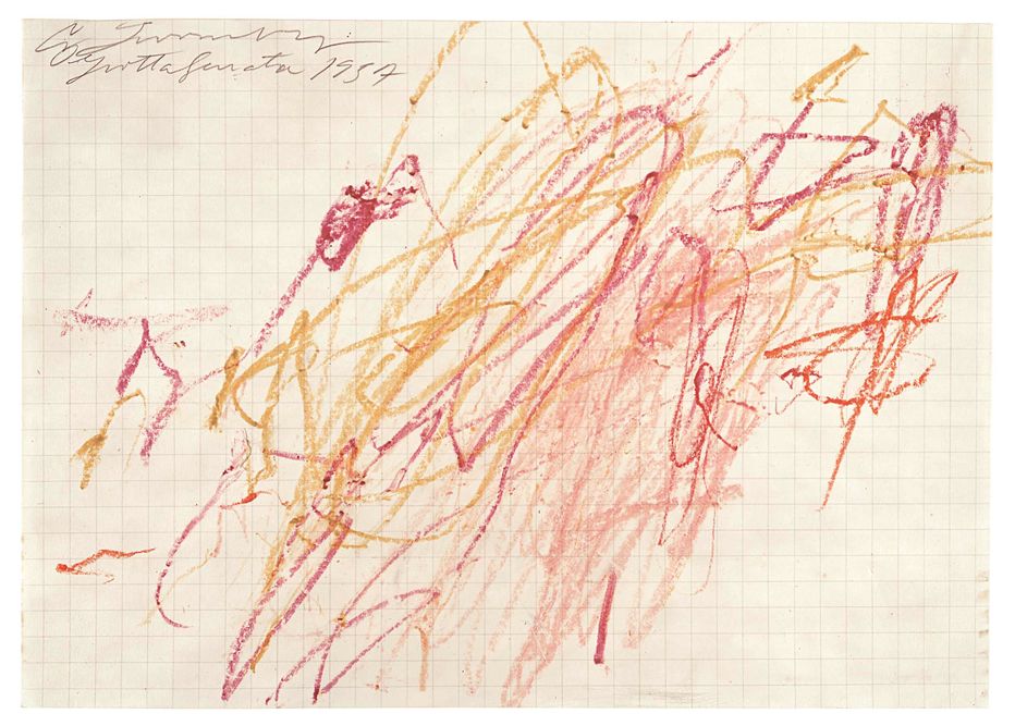 I raffinati scarabocchi di Twrombly custodiscono questioni ancestrali e istanze profondissime. Questi segni –pregni di mistero e fascinazione- incarnano l’origine del linguaggio, e quindi del pensiero umano: una sintesi frutto del connubio fra l’automatismo grafico dell’Action Painting di Pollock e i racconti mitici posti alla base della civiltà mediterranea. Si sviluppa così un disarmante cortocircuito fra tradizioni letterarie del vecchio continente e cultura figurativa del nuovo mondo, racconti millenari e istanze moderniste, figurazione e astrazione, ragione e sentimento.