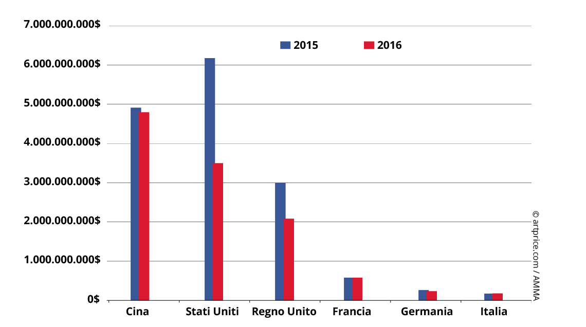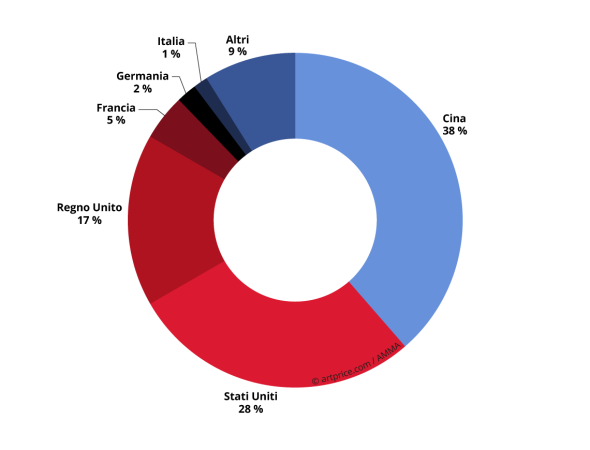 Il podio dunque ospita le medesime potenze mondiali dell’anno precedente, ma è caratterizzato da un fondamentale cambio al vertice. La crescita del mercato della Cina, le permette di superare gli USA, penalizzati dalla mancanza di elevati record nella piazza principale di New York, e di raggiungere il 38% del fatturato complessivo delle vendite in asta globali.