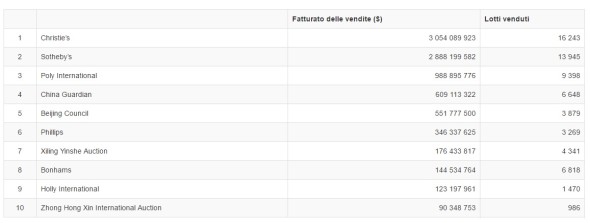 Interessante notare anche la presenza delle piazze di Hong Kong e Pechino all’interno di questo breve elenco. Un elemento non casuale, considerato che sono ben sei le case d’aste cinesi nella Top Ten per fatturato annuale e che le restanti quattro (in ordine di apparizione: Christie’s, Sotheby’s, Phillips e Bonhams) operano tutte nel mercato cinese con sedi a Hong Kong e Shangai