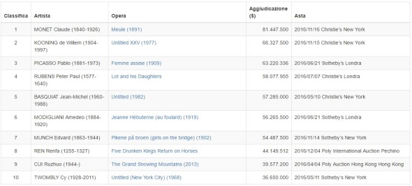 Come accennato, il trend generale dei risultati d’asta ha evidenziato una diminuzione del numero di opere aggiudicate per valori che superano i 10 milioni di dollari, dai 140 lotti del 2015 si passa agli 80 dell’anno successivo. Questa tendenza non indica però la scomparsa dei grandi capolavori dal mercato delle aste pubbliche, come testimonia il record mondiale del 2016 dell’opera “La Meule” (1891) di Monet , aggiudicata nel novembre scorso da Christie’s per 81,5 milioni di dollari.