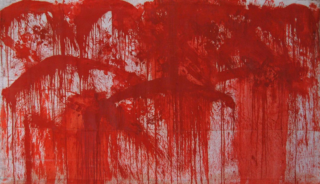 Hermann Nitsch (1938) elabora già dal 1957-1960 la sua idea di Orgien Mysterien Theatre (Teatro delle Orge e dei Misteri): esperienza di arte totale legata al concetto psicanalitico di Abreaktion, cioè la scarica emozionale che consente ad un soggetto di rimuovere gli effetti di accadimenti drammatici. L’esecuzione di atti orgiastici e onanistici con la messinscena di riti sacrificali consente, secondo l’artista, la liberazione catartica da tabù religiosi, moralistici, sessuali. Nel frattempo Nitsch dipinge seguendo il movimento del tachisme cioè l’immediatezza del gesto che versa o schizza colori sulla tela, anche usando direttamente le mani. Dal 1961 si intensificano le azioni in cui Nitsch comincia ad utilizzare gli animali macellati, il cui sangue viene usato come colore, così come aumenta il numero di partecipanti alle sue azioni con attori passivi crocefissi e cosparsi di sangue e attori attivi che utilizzano interiora di animali, si diversificano i materiali e gli apparati scenici. La provocazione si fa sempre più spinta tanto che nel 1965 Nitsch andrà in carcere per due settimane, ma si allarga anche il giro delle sue relazioni internazionali, specie con la Germania e gli Stati Uniti. Nel 1971 acquista il castello di Prinzerdorf in Austria che diventa la sede del suo Orgien Mysterien Theatre. Nel 1974 entra in contatto a Napoli con Giuseppe Morra e il suo Studio che diviene la sua galleria e il suo editore di riferimento, pubblicando l’O.M. Theatre 2, sua opera teorica fondamentale e gli spartiti musicali delle sue molteplici azioni sceniche. Nel corso degli anni Settanta-Ottanta si intensificano le partecipazioni alle grandi rassegne internazionali, gli interventi in prestigiosi musei e le esecuzioni musicali. Nel 1984 la sua 80.ma azione dura tre giorni e tre notti consecutive e dieci anni dopo Morra ne pubblica la partitura integrale. Dagli anni Novanta prevalgono in tutto il mondo le esposizioni dotate di forte energia espressiva, in cui Nitsch installa i relitti, gli oggetti, le grandi tele, le partiture, i progetti grafici che hanno dato vita alla sua personalissima esperienza artistica, in cui confluiscono teatro, pittura, musica, fotografia, video, performance.