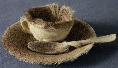 Lo scambio materiale implicito nella tazza in pelliccia fa incontrare l’elemento culinario con quello animalesco, il freddo con il caldo, e la visualizzazione del senso del tatto crea una relazione sensoriale fisica con l’osservatore.
