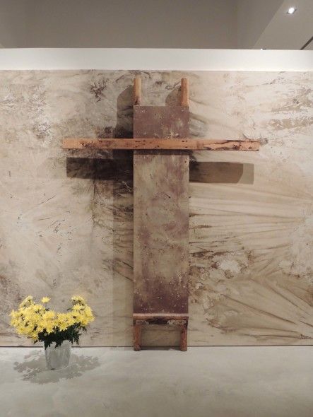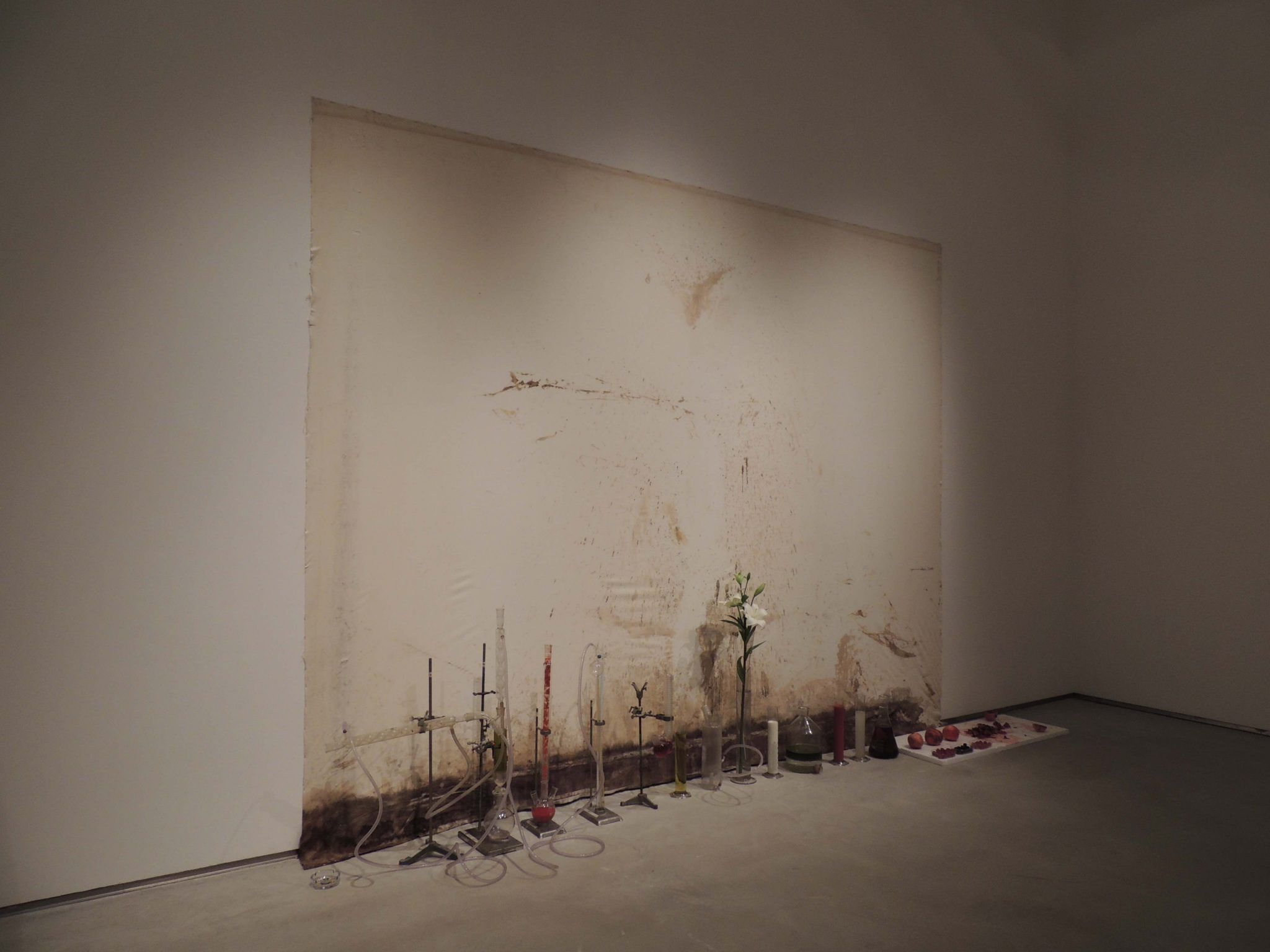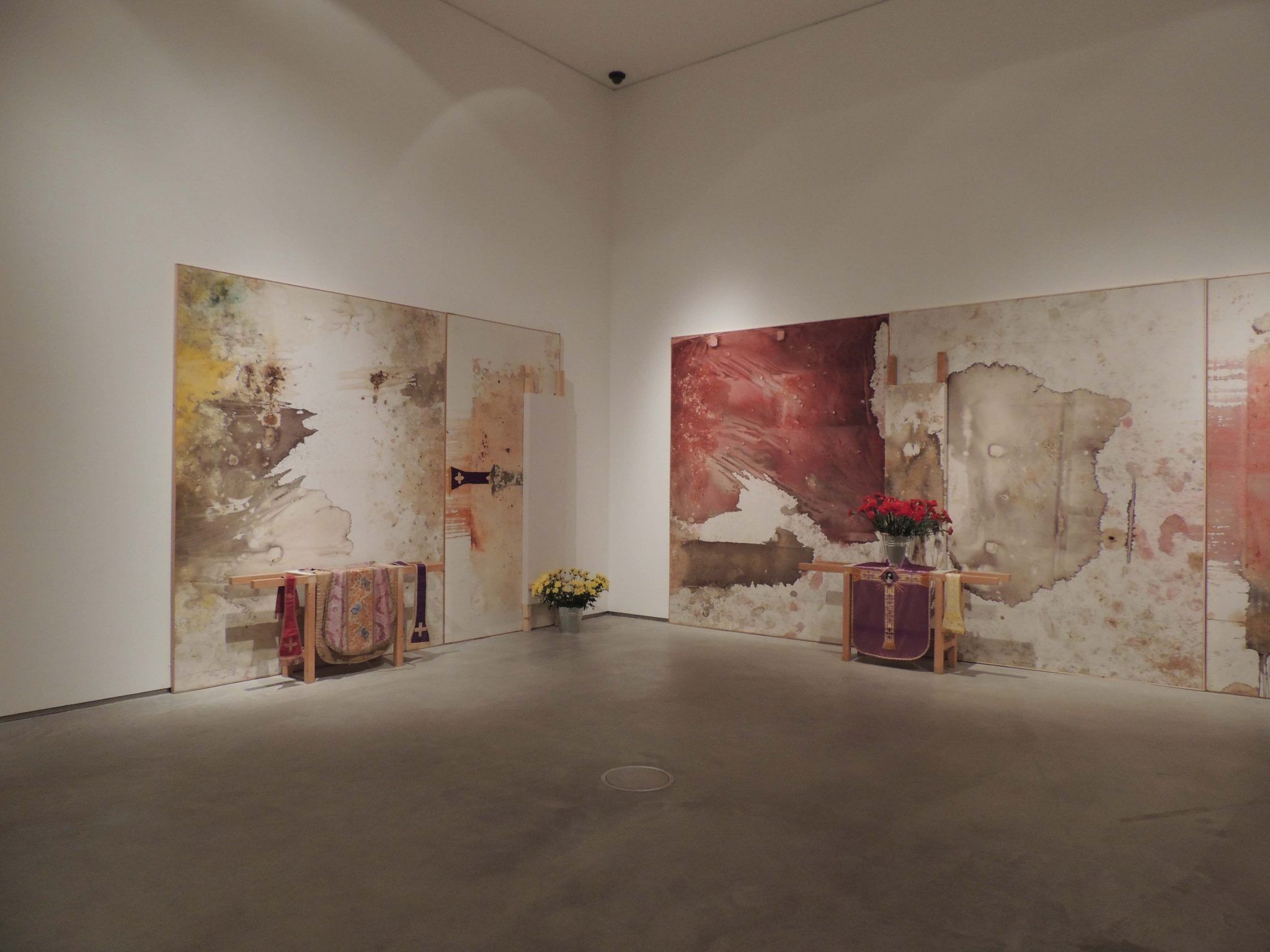 Oltre ai video, proiettati al piano inferiore, quello che si vede a Foligno sono dunque i Relitti delle Azioni del Maestro austriaco. Sono gli elementi provenienti dall’Azione scenica, sono i ritagli dei grandi teli bianchi, i camici (o “tonache”), le barelle servite per trasportare i corpi che qui diventano altari, ampolle e attrezzi chirurgici che rimandano ai corpi e ai loro umori, perfettamente puliti: tutti oggetti che alla vista determinano un disagio emotivo. A questi si aggiungono le zollette di zucchero e i fazzoletti bianchi, posti in file ordinate per dialogare, grazie al loro candore, con gli altri elementi.