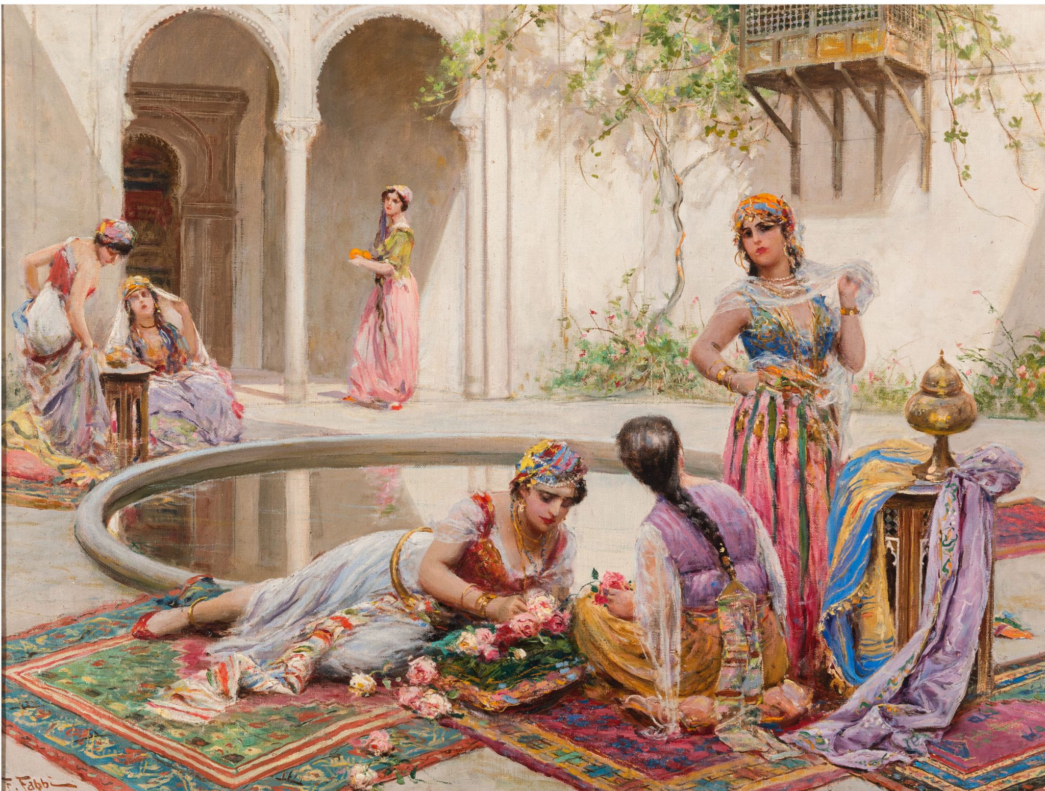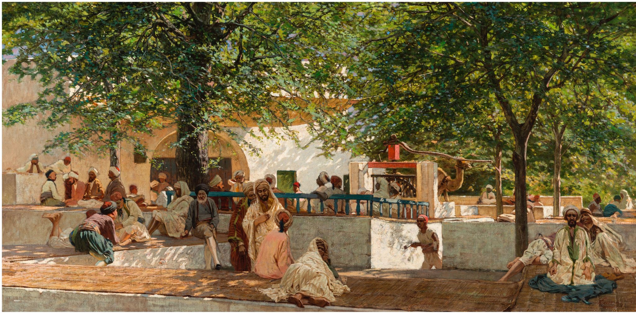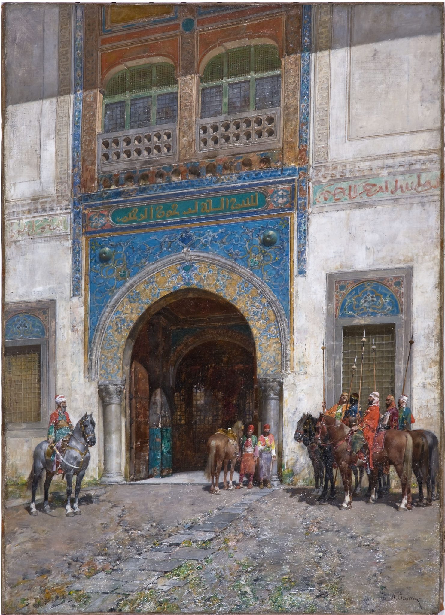 Una rassegna in quattro sezioni che spaziano da scene di genere di pittori che intrapresero lunghi viaggi in terre lontane, a soggetti d’invenzione realizzati da artisti che l’Oriente l’avevano soltanto immaginato. La letteratura e la musica del tempo diedero un apporto fondamentale a questa tendenza: l’Aida di Giuseppe Verdi fu eseguita per la prima in Egitto nel 1871 contribuendo fortemente al recupero di atmosfere orientali nelle arti visive.