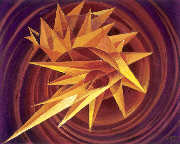 Qual è, dunque, il movimento più impetuoso nel 1916? La guerra, naturalmente: perciò Depero sceglie un Paesaggio Guerresco come teatro dinamico di forme e di linee sempre più astratte, nel quale “esplosioni giallo e nero e tricolori” scatenano una violentissima spinta centrifuga.