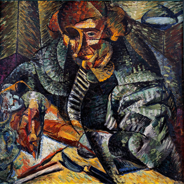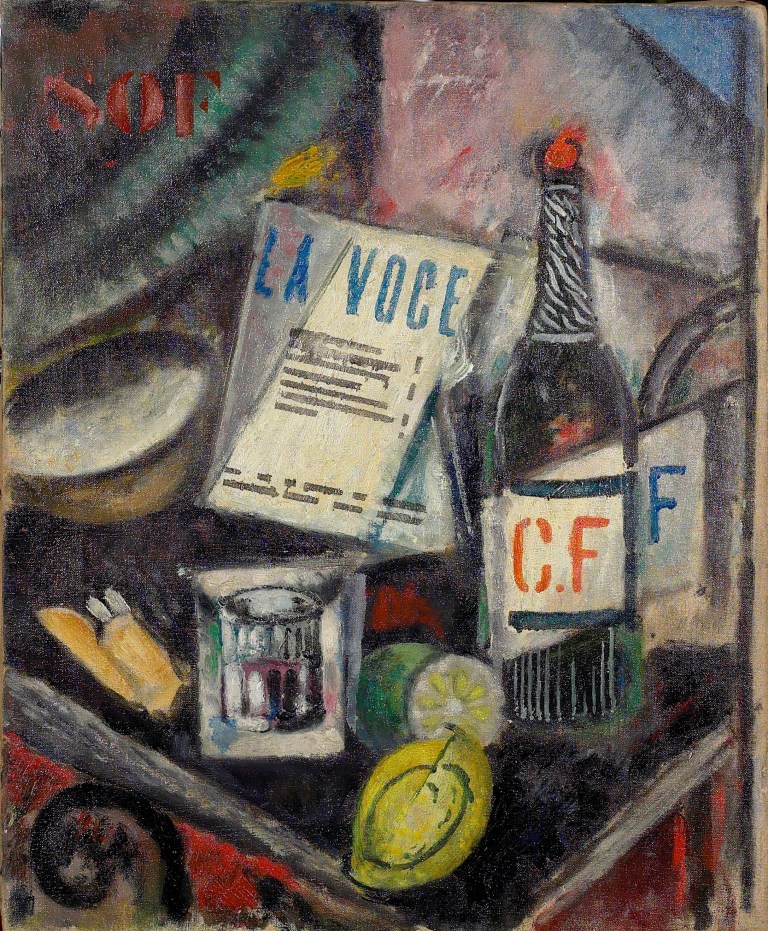“Largo ai giovani, ai violenti, ai temerari!”, largo al Futurismo storico. Marinetti, Boccioni, Russolo, Carrà, e Severini sono i protagonisti indiscussi della prima parte della mostra. Mentre Luigi Russolo inventa gli “intonarumori”, i primi due scrivono una “lettera futurista” (1915) a quattro mani, rivolgendosi al poeta ed amico Cangiullo con un affettuoso “caro fesso”. Non c’è da stupirsi: è il gergo tipico della rivista d’avanguardia Lacerba, la cui intestazione su carta stampata è ben visibile nell’opera Lacerba e bottiglia (1914) di Carlo Carrà, un collage chiaramente ispirato alle nature morte di Ardengo Soffici (Popone e fiasco di vino, 1914; Natura morta, 1915).