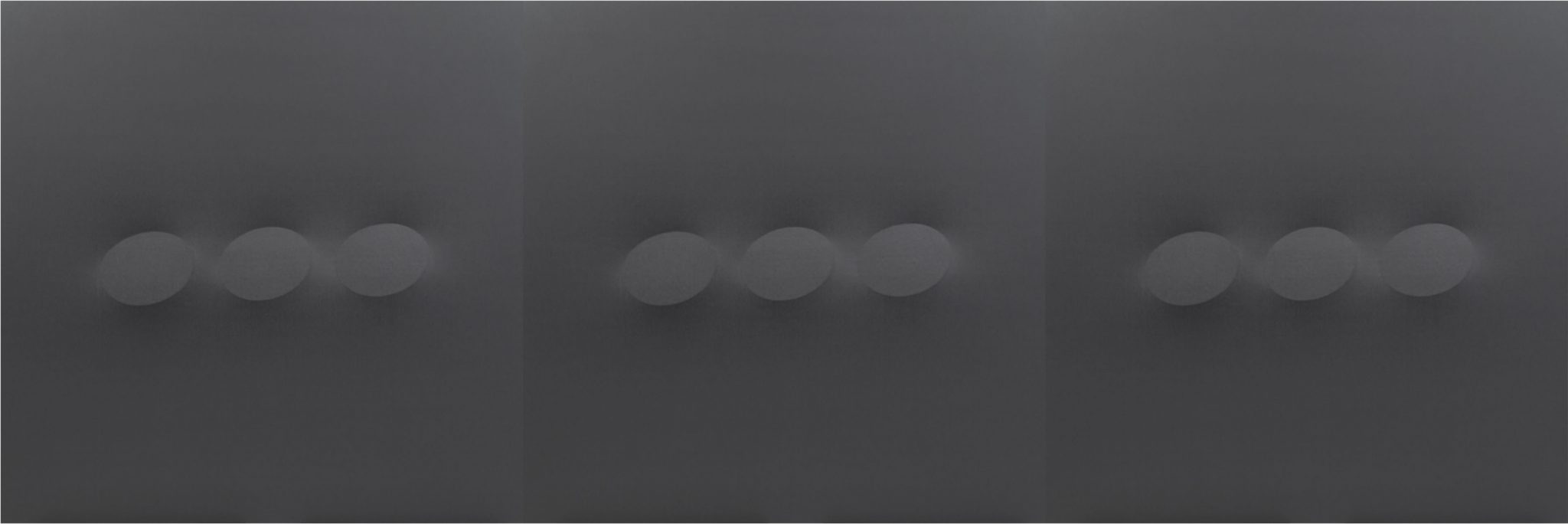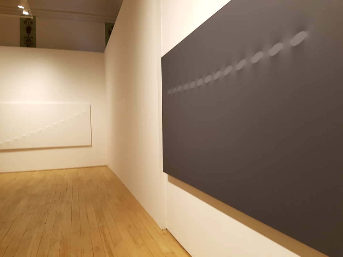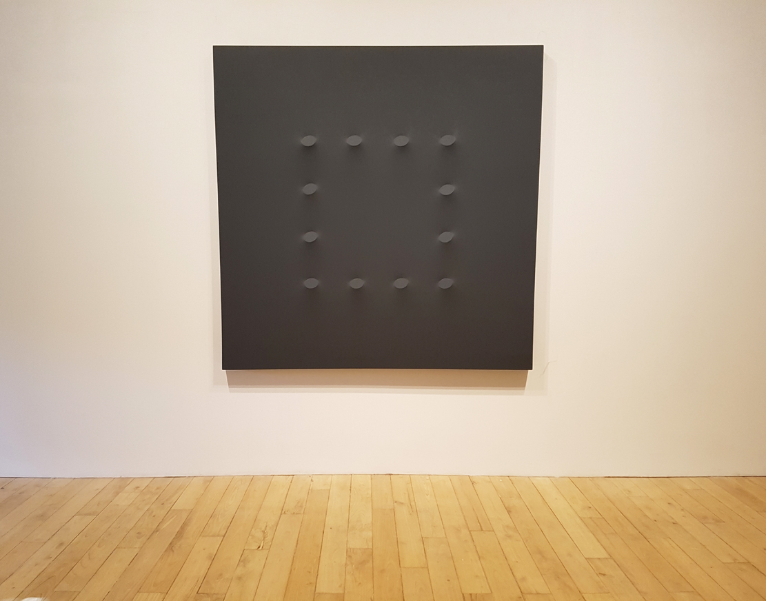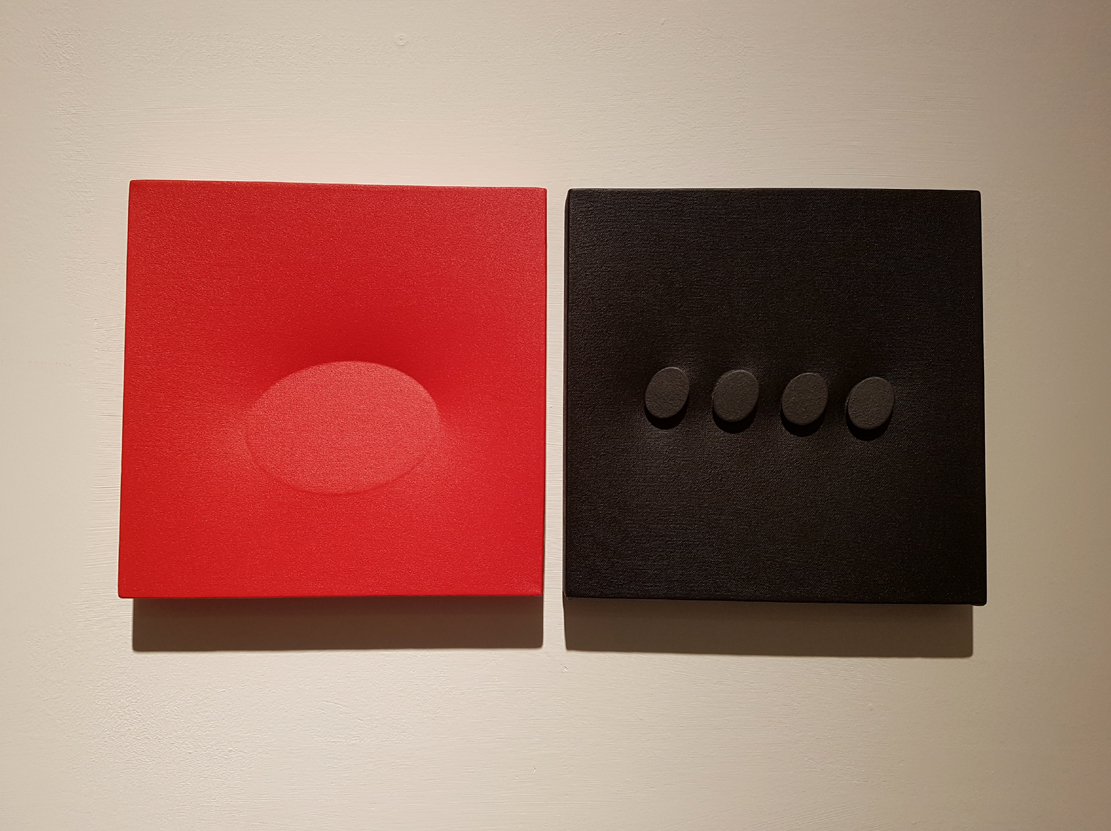 Il suo “Ovale” nasce quasi casualmente da una candela sul tavolo del suo studio che porta l’artista a bruciacchiare gli angoli dei fogli che aveva sottomano. Il genio si sposa con la geometria: ovali gialli, rossi, blu e neri fuoriescono dalla tela e segnano il trascorrere del tempo e lo spazio circoscritto. “Declinazioni spaziali verso estensione ambientale” (Bruno Corà). Dialettica tra opera e osservatore.