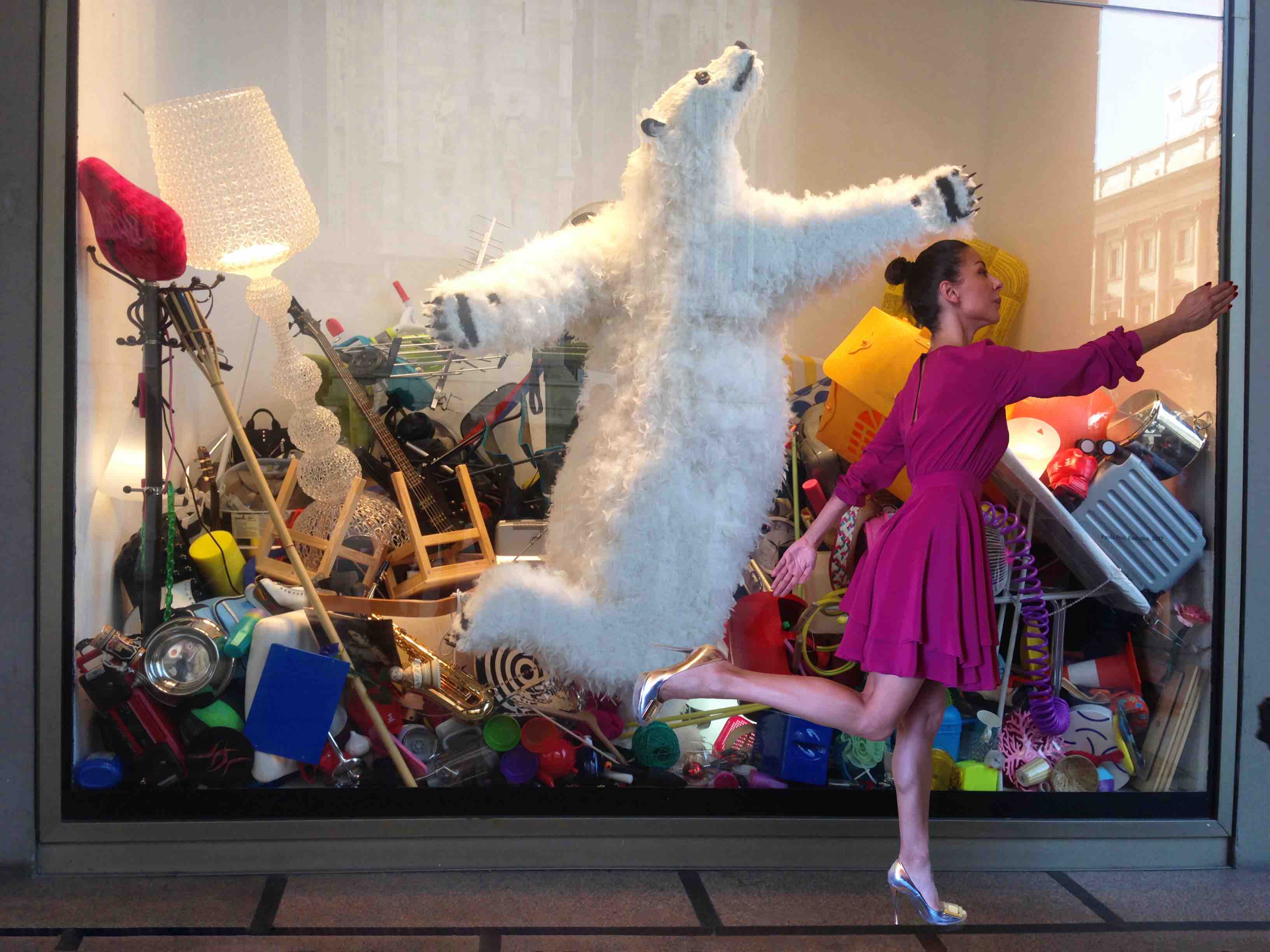 L’artista ridisegna le otto vetrine affacciate su piazza Duomo invitando a entrare nel suo universo, un mondo surreale, governato dalle leggi dell’assurdo, un sogno ad occhi aperti, dove tutto è possibile.