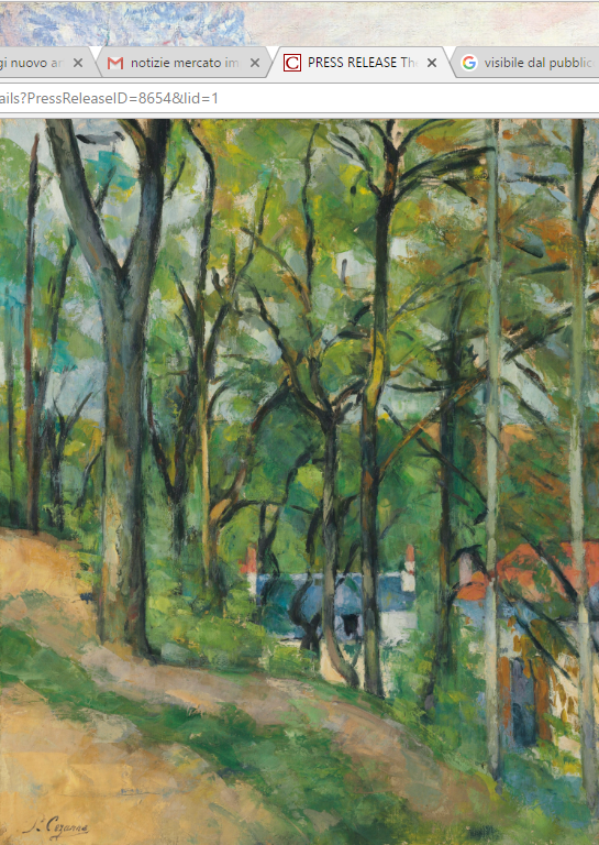 Ad accompagnare il dipinto di Monet nel tour di Hong Kong, è stat l’opera di Paul Cézanne: “La Côte Saint-Denis à Pontoise”. Realizzata due anni prima, nel 1877, la tela stima oggi da Christie’s $ 5-7 milioni. Anche in questo caso un paesaggio, ma se possibile opposto a quello di Monet. A dominare la composizione sono infatti le linee verticali e i colori tipici della produzione di Cézanne, i verdi i marroni della vegetazione che coprono le sfumature azzurre rosee e panna delle abitazioni.