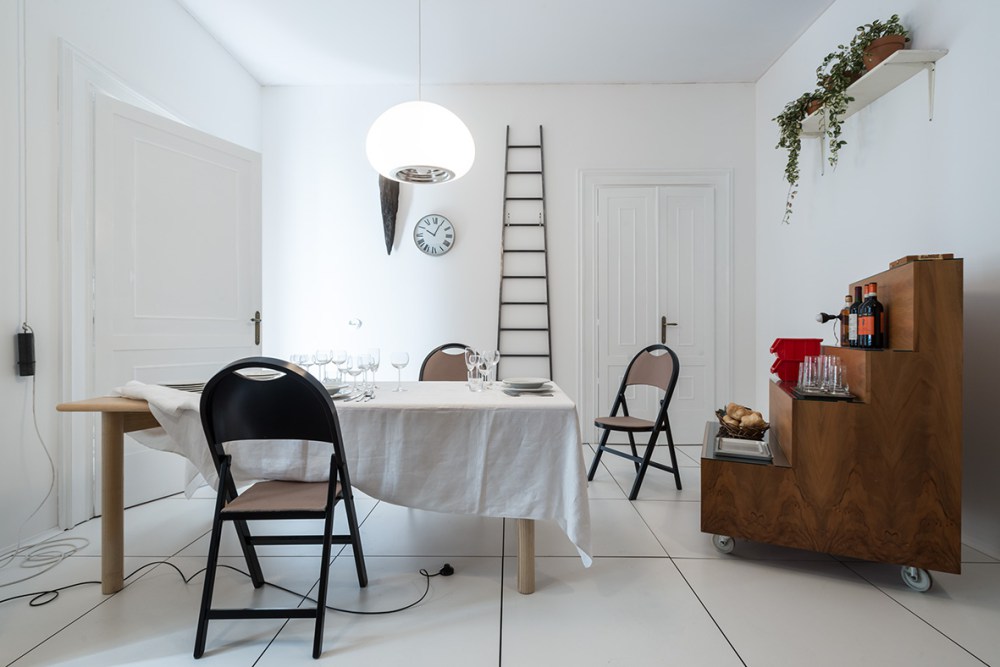La tavola parzialmente apparecchiata, i piatti impilati e le sedie non ancora disposte, portano sulla scena una libertà, tutta nuova, di gestire ed organizzare lo spazio. A concretizzare questo concetto è, per esempio, il mobile Rampa, piano d’appoggio su ruote, da un lato scaffale e dall’altro scrittoio. E ancora, la possibilità di determinare di volta in volta, in modo semplice ed autonomo la disposizione dell’arredamento, si traduce la nella sedia pieghevole Tric, rivisitazione Thonet, con schienale e seduta rivestiti in feltro.