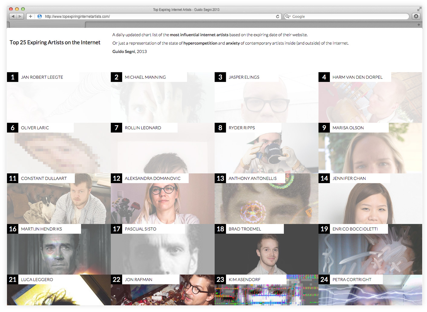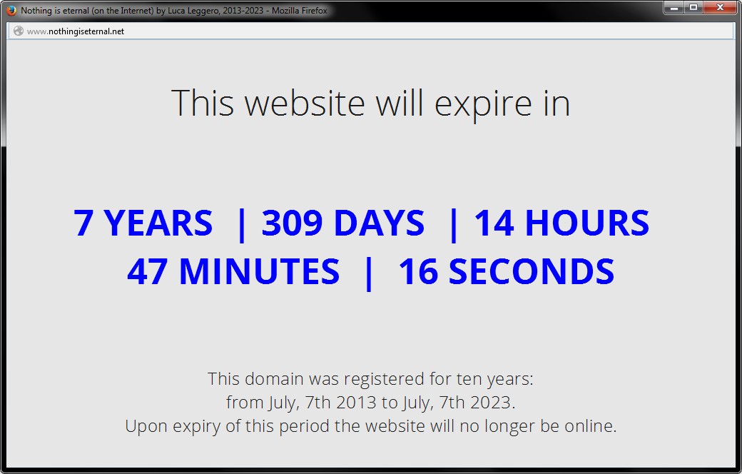 Le opere datate 2013 mostrano la convergenza delle due ricerche artistiche nella riflessione sulla obsolescenza programmata con opere fruibili solo tramite il web. Mentre due progetti datati 2015, A quiet desert failure di Guido Segni e la serie di tele Google Art on Canvas di Luca Leggero fanno riferimento alle immagini immagazzinate da Google Art e Google Maps. Seguono opere dal carattere talvolta più critico altre volte più ironico che indagano i meccanismi dei fenomeni di massa che caratterizzano l’era digitale, esempio per eccellenza sono i social media: Facebook Igbt Flag (2015) di Leggero e Work Less Work All (2014) di Segni.