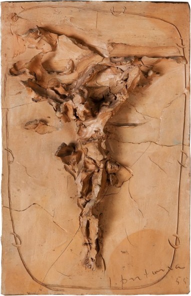 Fra le opere più importanti si segnalano una Piazza d’Italia di Giorgio de Chirico (olio su tela cm 60×50), una palma di Mario Schifano (Oasi 1967, spray e smalto su tela cm 200×70, provenienza: Marconi Milano) e una delicata crocifissione di Lucio Fontana (Cristo 1955, terracotta cm 55×35) che ha conquistato al copertina del catalogo.