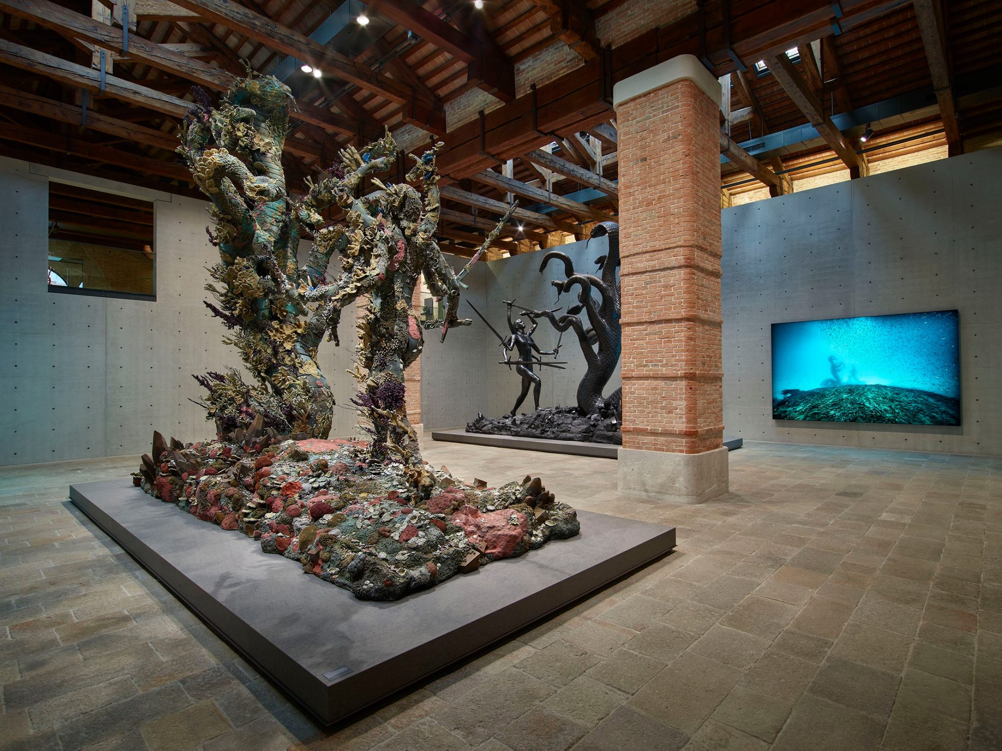 Ecco la storia di pura fantasia: “Tutto ha inizio con una leggenda: tra il I e il II secolo d.C., uno schiavo affrancato originario di Antiochia, Cif Amotan II, sfrutta la sua ricchezza per accumulare oggetti, ori, rarità della natura e opere d’arte da tutto il mondo. Decide poi di trasferire la sua eclettica quanto preziosa collezione su un’isola nell’Oceano Indiano, dove aveva fatto erigere un tempio dedicato al dio Sole. Ma il vascello – chiamato Apistos, ‘incredibile’ – affonda prima di arrivare a destinazione, trascinando nelle profondità del mare il suo carico di incommensurabile valore. Con il passare dei secoli, la sua esistenza diventa una diceria, finché non viene riscoperto nel 2008 al largo della costa orientale dell’Africa. Ed ecco che entra in scena Damien Hirst che decide di finanziare le operazioni di recupero e, infine, di esporre al pubblico l’enorme tesoro riportato alla luce nei 5mila metri quadri distribuiti tra Punta della Dogana e Palazzo Grassi”.