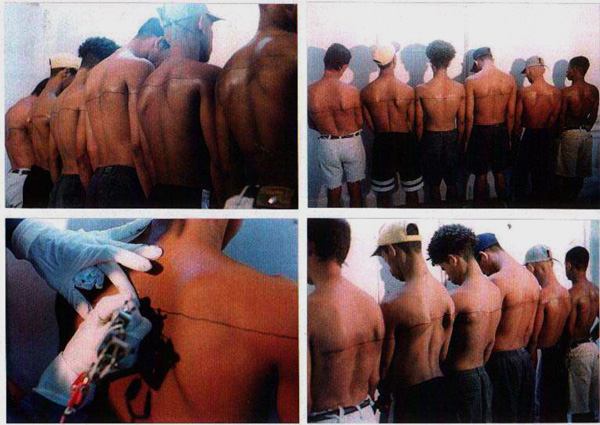 Poco cambia che si tratti di qualche ora di attesa, come nel caso della fila indiana creatasi all’esterno del Padiglione per ricevere 10 euro ognuno, o che invece sia un marchio eterno, come il tatuaggio di una linea orizzontale continua sulla schiena di gruppi di persone, azione che ripete all’Avana, a Città del Messico e a Salamanca.