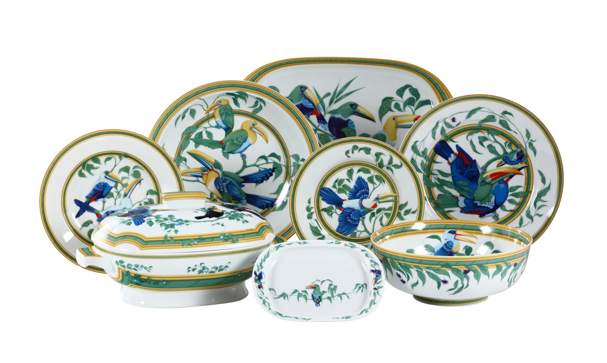 in composto da 24 piatti piani da cm 27; 12 piatti da zuppa di cm 23; 12 piatti da dessert da cm 21; una raviera; una zuppiera di cm 31; un vassoio ovale di cm 39,5; 1 piatto da portata fondo di cm 29 ed un’insalatiera di cm 24.