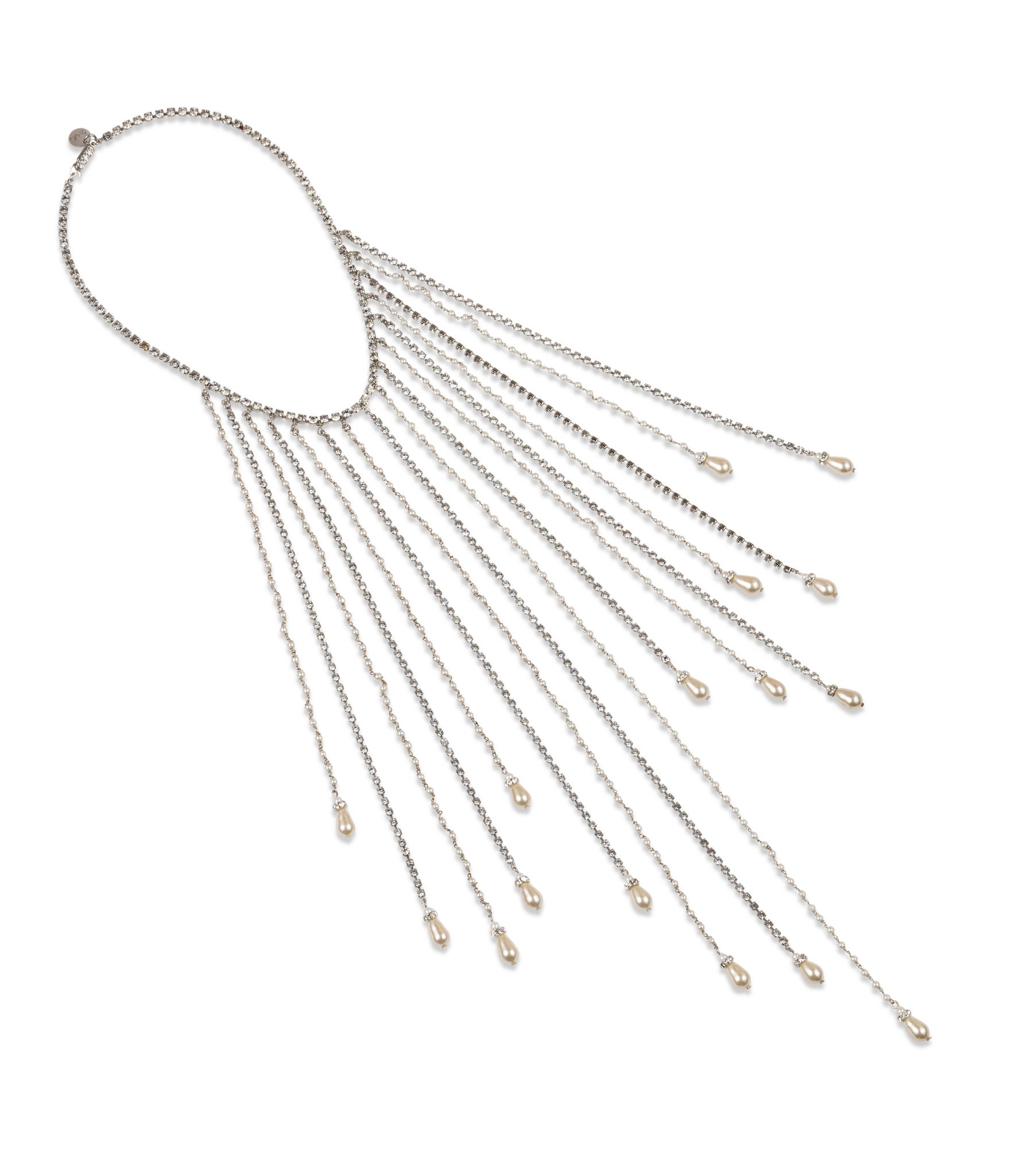 in metallo argentato, cristalli Swarovski e perle d’imitazione, firmato, cm 55