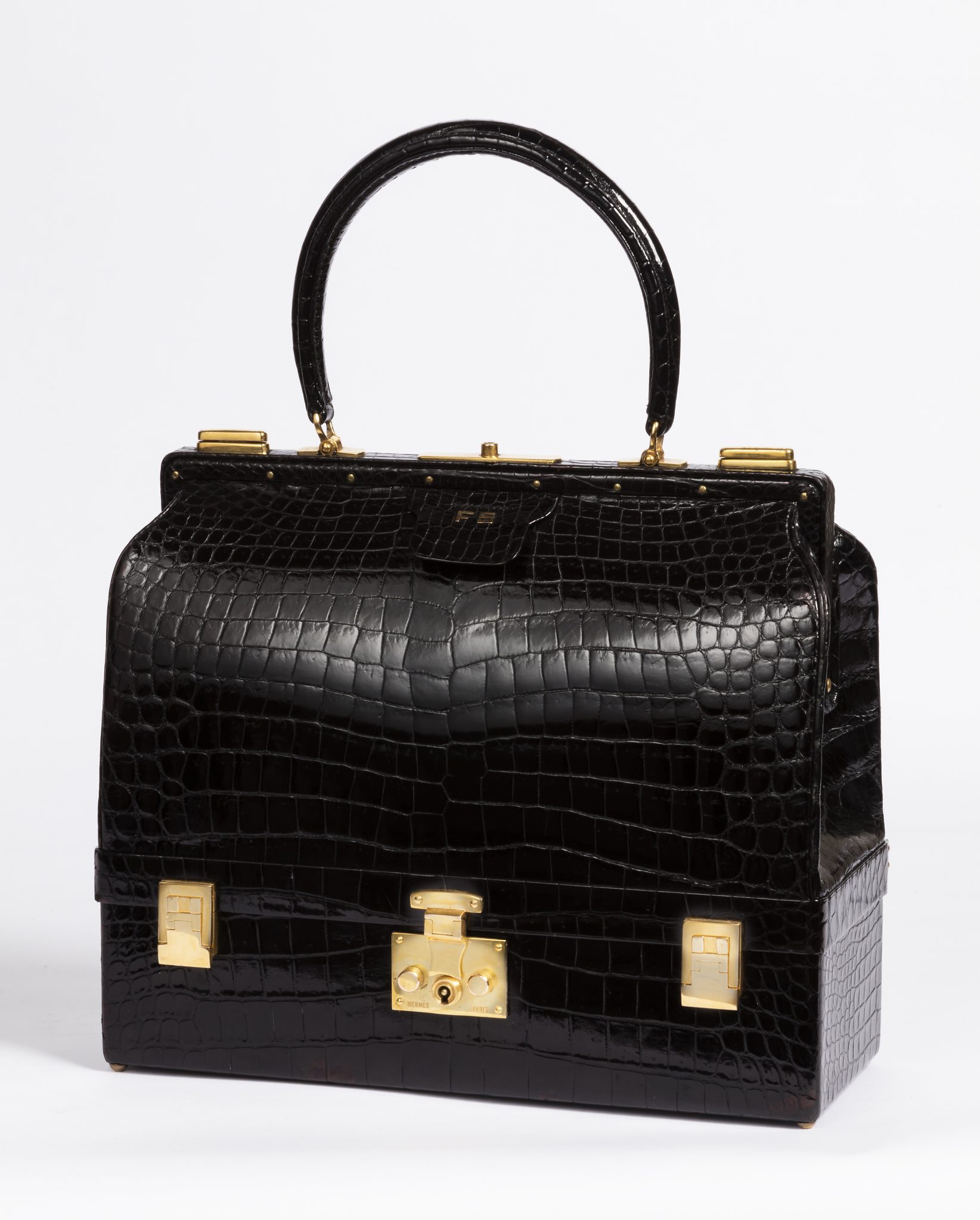 in coccodrillo nero con portagioie sul fondo, con chiavi e clochette in pelle, cm 24×29