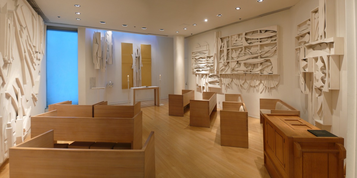 Per l’artista Americana Louise Nevelson, la spiritualità era strettamente legata alla creatività. Così, quando le fu commissionata la progettazione di The Chapel Of The Good Shepherd – sita all’interno della Chiesa di Saint Peter a Manhattan – la considerò un’opportunità. Creò un ambiente scultoreo, in chiave astratta, con opere murali a parete. L’artista desiderava uno spazio astratto abbastanza da poter essere universale. In modo che chiunque potesse sperimentare al suo interno un senso di gioia e pace. Tradusse icone religiose in complesse sculture fatte di legno e pitturate di bianco. Gli unici elementi colorati nella stanza sono l’altare – oro – e le panche – fatte di legno chiaro.