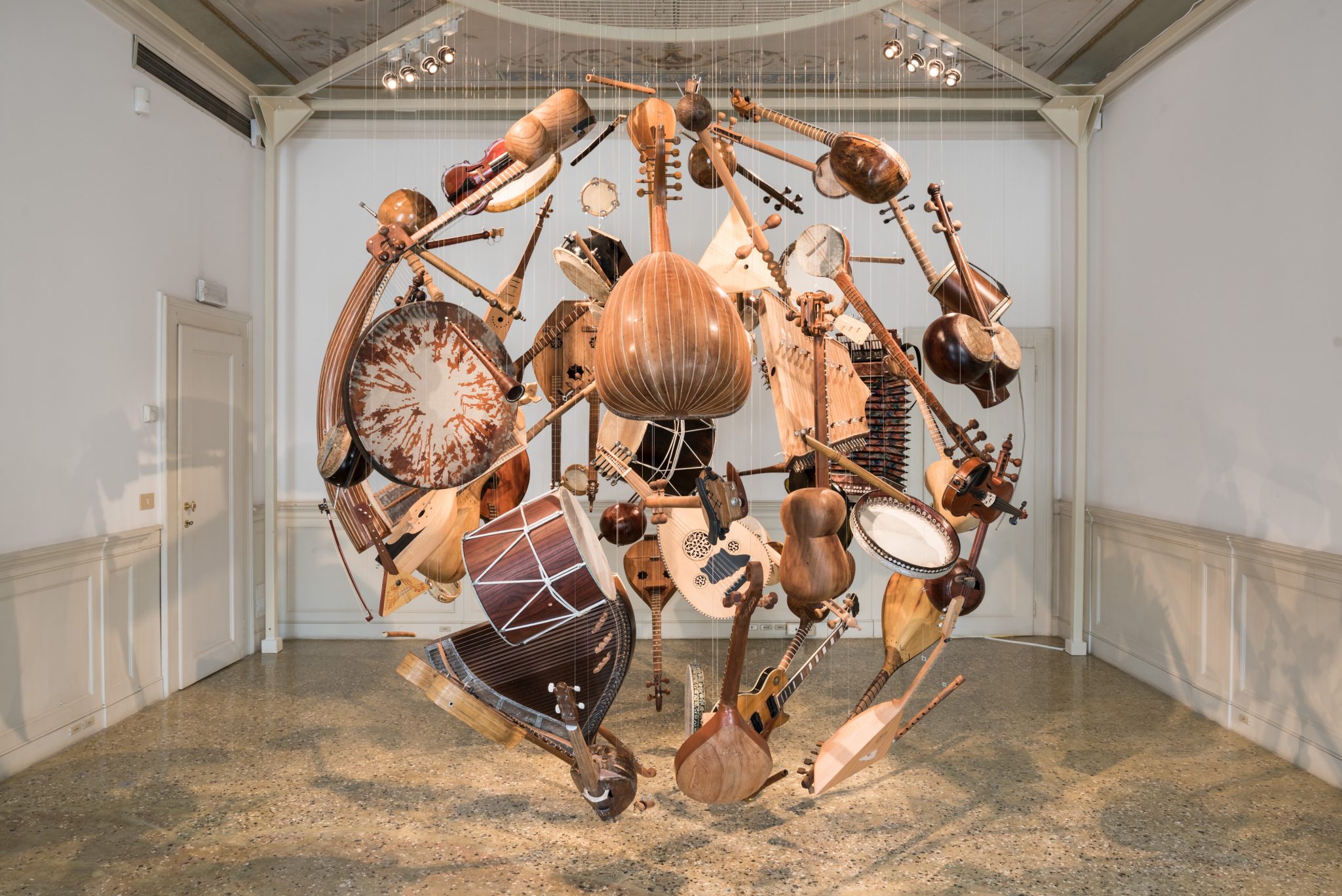 Da un punto di vista artistico, però, il Padiglione curato da Martin Roth ed Emin Mammadov possiede una notevole bellezza, soprattutto in forza delle installazioni di Elvin Nabizade, costruite utilizzando strumenti musicali, in particolare il saz, strumento a corde tipico del Paese; e la musica è sempre stato un fattore di unità fra i popoli, in Azerbaijan come nel resto del mondo. L’arco e la sfera realizzate da Nabizade sono simboli di unità e armonia, e dialogano piacevolmente con le sale di Palazzo Lezze. Tecnicamente suggestive, ma più asettiche, le installazioni video del collettivo Hypnotica, fra cui Unity, che raccoglie le testimonianze di circa venti azeri, artisti e non, ognuno dei quali racconta la propria storia personale, le sue radici etniche, le sue tradizioni culturali; una sintesi dell’eterogeneo panorama azero. L’intento è quello di far conoscere al mondo l’unità interna che regna nel Paese, la concordia fra le varie etnie. Eppure, la realtà che il visitatore si trova davanti, ha un sapore troppo patinato per essere del tutto credibile, è troppo simile ai vecchi musei “patriottici” dell’Unione Sovietica, scenograficamente perfetti, suadenti nell’accuratezza di una riproduzione storica “adattata” agli scopi di regime. Si deve poi considerare un dettaglio: il Padiglione è organizzato dalla Heydar Aliyev Foundation, che, per quelle strane coincidenze della vita, fa capo all’ex presidente della Repubblica, nonché padre del presidente attuale. Per capire meglio questa Padiglione, è necessaria una parentesi sulla storia recente dell’Azerbaijan.