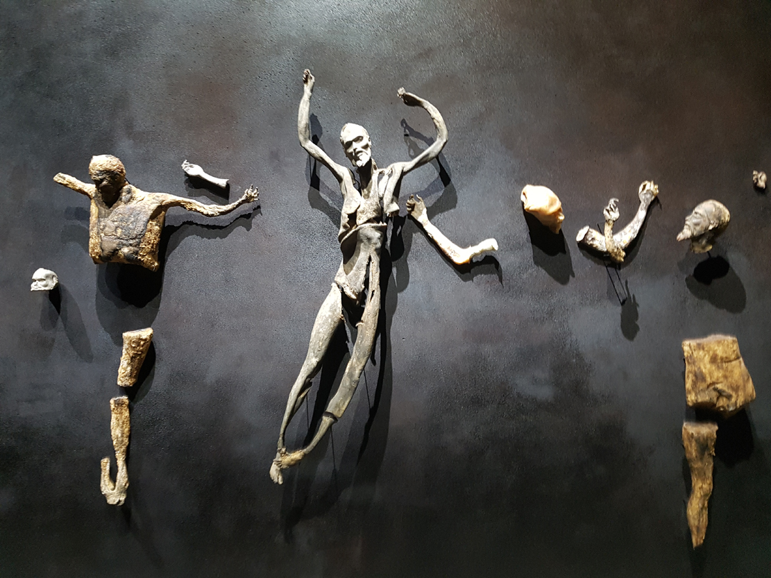 Sfugge un poco l’estetica del nuovo materialismo tecnologico ed il rapporto con il testo dell’Imitatio Christi, libro di devozione cristiana del basso medioevo. Ma tant’è Robero Cuoghi questo dice a giustificazione della sua installazione a metà tra il forno da pizzeria ed il laboratorio di Frankenstein Junior che sforna corpi deposti lungo un percorso asettico tipo laboratorio di ricerca. Si garantisce che la produzione non si esaurisce con l’apertura della mostra, ma perdura secondo una logica di decomposizione e composizione, morte e rigenerazione. L’intero processo è concepito per produrre una dissociazione che riguarda il nostro presente. Benissimo.