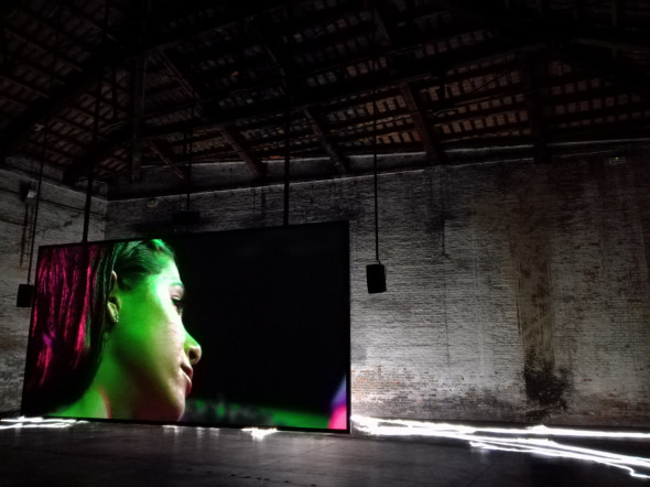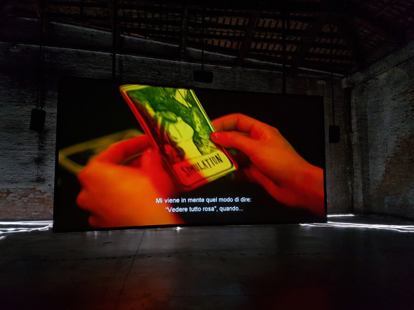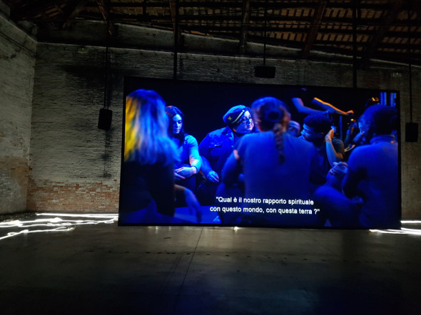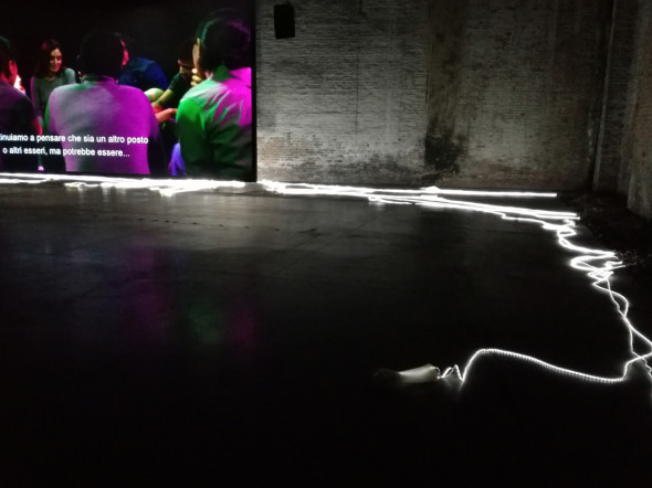 Il secondo spazio del Padiglione Italia, quello di Adelita Husni-Bey, mantiene la caratteristica dell’assenza della luce. A differenza del primo, è essenziale negli elementi allestitivi. Un mega schermo attraverso cui passano immagini di un gruppo di persone che dialogano in inglese, con sottotitoli in italiano. Un flusso di canaline segna un ipotetico percorso di luce fioca bianca che va dall’entrata fino allo schermo. Una scalinata di fronte allo schermo permette, a chi vuol vedere tutta la video proiezione, di sedersi a guardare.