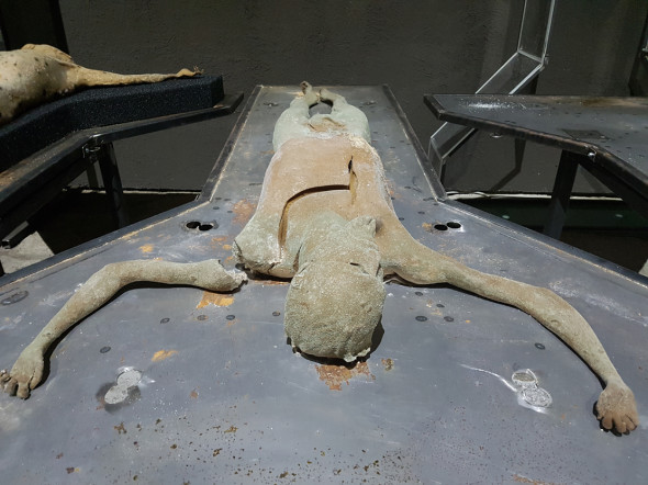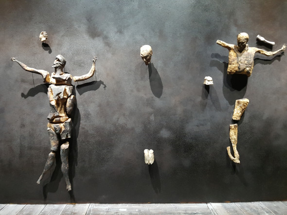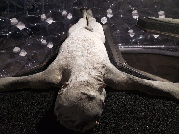 Un calco, ad imitazione della figura di Cristo, in lega con anima in silicone, accoglie materiali organici che vengono consolidati e poi posti,su tavole/letti per l’essicazione, in celle dove infiltrazioni di muffe, li trasformano mentre si consolidano fino a quando l’artista stesso, soddisfatto del processo ottenuto, ne ferma la trasformazione. A quel punto li poggia su una parete in una sorta di mostra di opere d’arte.Partendo da un processo uguale per tutti i calchi che realizza, e partendo quindi da una forma sempre identica, Roberto Cuoghi attraverso l’insieme dei procedimenti, ottiene risultati ogni volta differenti, ogni volta unici.In questa installazione ancora una volta il corpo, che Roberto Cuoghi da sempre utilizza come espressione artistica, è medium ma questa volta non coinvolge l’artista in prima persona.E’invece un simbolo/corpo, la figura di Cristo, ad introdurci una riflessione sul potere magico ed evocativo delle immagini, sulla forza della ripetizione e sulla memoria iconografica della storia dell’arte.
