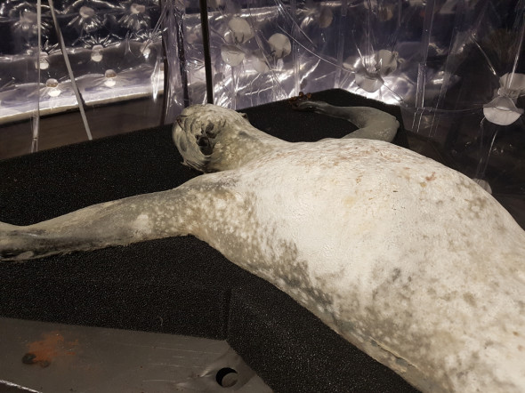 Ma ripartiamo dall’allestimento. Qui il buio è l’essenza dello spazio che è stato diviso in parte inferiore e parte superiore. La parte inferiore è quella cui si accede lasciandosi alle spalle l’installazione di Adelita Husni-Bey. E’ un mare di tubi da ponteggio cui una tantum sono aggrappate una serie di sculture in bronzo bianco raffiguranti grandi conchiglie (Pinna nobilis). I tubi sorreggono una piattaforma che copre quasi interamente l’ampio spazio. I tubi stessi però sono posti in modo da formare cinque navate di una basilica, al cui fondo si struttura una scalinata. E’ questa che traghetta i visitatori al secondo livello aprendo loro una visione immaginifica e solenne, mastodontica. Il miraggio è quello di una distesa d’acqua in cui si riflette il soffitto del padiglione, ribaltandosi nel suo stesso riflesso, e rimandando un’illusione di spazio amplificato e straniante in cui l’architettura ha, appunto, l’effetto di un miraggio. E’ l’occasione qui per riflettere sullo sdoppiamento, sull’immagine specchiata, sul doppio. Ma è anche l’occasione per riflettere sulla connessione tra due mondi, quello degli inferi e della realtà terrena/volta celeste, al mondo dei vivi e dei morti di cui il libro La fine del mondo dell’antropologo napoletano Ernesto de Martino parla.