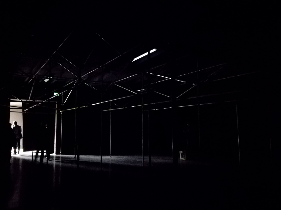 Una serie di pesanti drappeggi, tende nere, attraverso cui passare, dividono gli spazi dedicati ai tre artisti, dove la caratteristica costante resta il buio. Roberto Cuoghi utilizza luci fioche che illuminano alcune aree determinati per allestimento che ha imbastito e che richiama al contempo le atmosfere alchimiste, la macchina rigeneratrice di vita evocata da Robert Louis Stevenson in Lo Stano caso del dottor Jekyll e del signor Hyde e le fabbriche di produzione di modelli sempre uguali e ripetitivi.