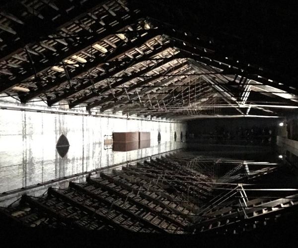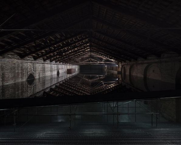 Ma ripartiamo dall’allestimento. Qui il buio è l’essenza dello spazio che è stato diviso in parte inferiore e parte superiore. La parte inferiore è quella cui si accede lasciandosi alle spalle l’installazione di Adelita Husni-Bey. E’ un mare di tubi da ponteggio cui una tantum sono aggrappate una serie di sculture in bronzo bianco raffiguranti grandi conchiglie (Pinna nobilis). I tubi sorreggono una piattaforma che copre quasi interamente l’ampio spazio. I tubi stessi però sono posti in modo da formare cinque navate di una basilica, al cui fondo si struttura una scalinata. E’ questa che traghetta i visitatori al secondo livello aprendo loro una visione immaginifica e solenne, mastodontica. Il miraggio è quello di una distesa d’acqua in cui si riflette il soffitto del padiglione, ribaltandosi nel suo stesso riflesso, e rimandando un’illusione di spazio amplificato e straniante in cui l’architettura ha, appunto, l’effetto di un miraggio. E’ l’occasione qui per riflettere sullo sdoppiamento, sull’immagine specchiata, sul doppio. Ma è anche l’occasione per riflettere sulla connessione tra due mondi, quello degli inferi e della realtà terrena/volta celeste, al mondo dei vivi e dei morti di cui il libro La fine del mondo dell’antropologo napoletano Ernesto de Martino parla.
