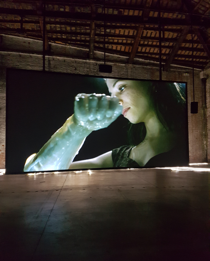 Il secondo spazio del Padiglione Italia, quello di Adelita Husni-Bey, mantiene la caratteristica dell’assenza della luce. A differenza del primo, è essenziale negli elementi allestitivi. Un mega schermo attraverso cui passano immagini di un gruppo di persone che dialogano in inglese, con sottotitoli in italiano. Un flusso di canaline segna un ipotetico percorso di luce fioca bianca che va dall’entrata fino allo schermo. Una scalinata di fronte allo schermo permette, a chi vuol vedere tutta la video proiezione, di sedersi a guardare.