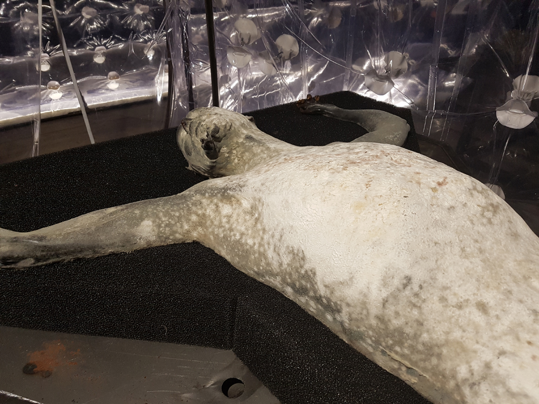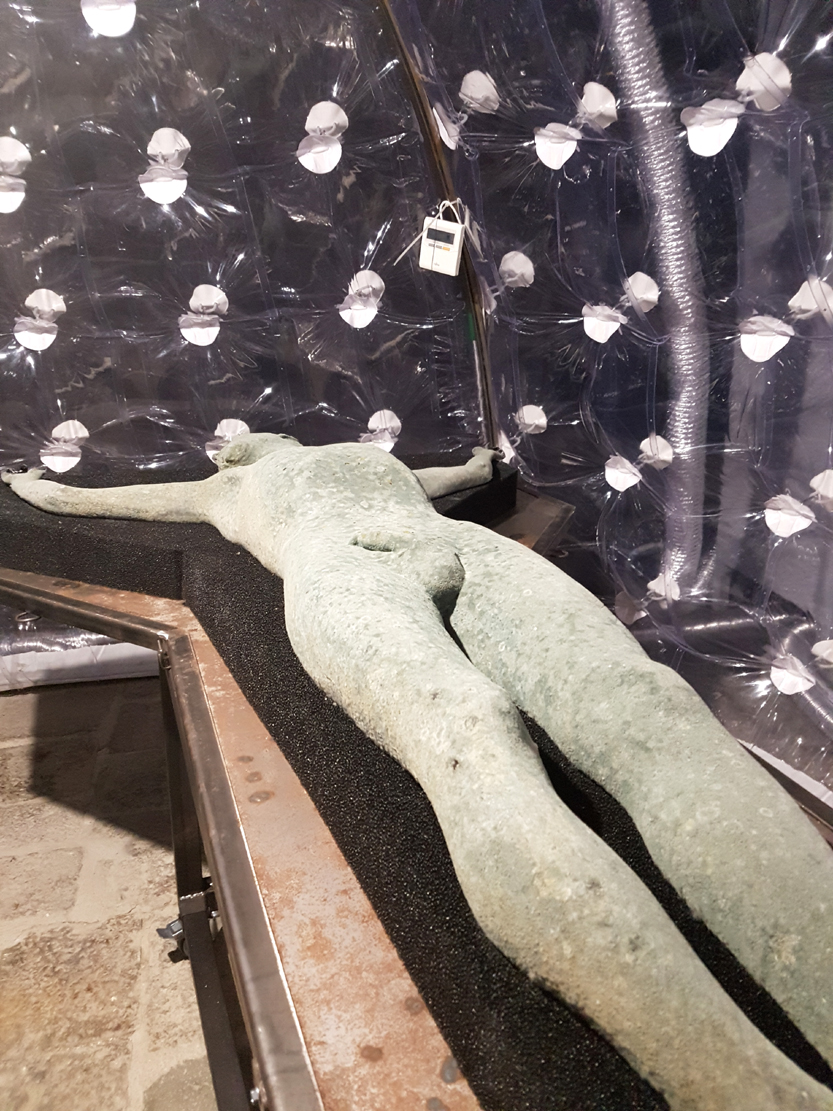 Un calco, ad imitazione della figura di Cristo, in lega con anima in silicone, accoglie materiali organici che vengono consolidati e poi posti,su tavole/letti per l’essicazione, in celle dove infiltrazioni di muffe, li trasformano mentre si consolidano fino a quando l’artista stesso, soddisfatto del processo ottenuto, ne ferma la trasformazione. A quel punto li poggia su una parete in una sorta di mostra di opere d’arte.Partendo da un processo uguale per tutti i calchi che realizza, e partendo quindi da una forma sempre identica, Roberto Cuoghi attraverso l’insieme dei procedimenti, ottiene risultati ogni volta differenti, ogni volta unici.In questa installazione ancora una volta il corpo, che Roberto Cuoghi da sempre utilizza come espressione artistica, è medium ma questa volta non coinvolge l’artista in prima persona.E’invece un simbolo/corpo, la figura di Cristo, ad introdurci una riflessione sul potere magico ed evocativo delle immagini, sulla forza della ripetizione e sulla memoria iconografica della storia dell’arte.