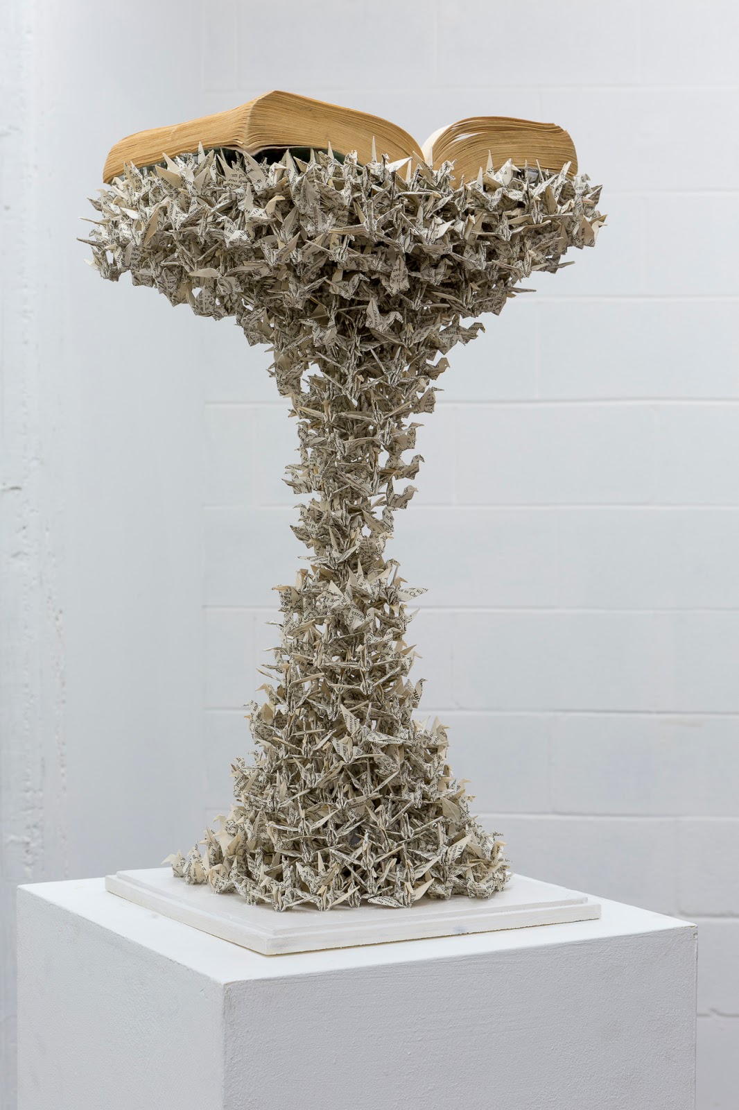 Ogni libro è una scultura sospesa realizzata con volumi antichi, vecchie pubblicazioni di grandi scrittori che hanno fatto la storia della letteratura, tomi talvolta abbandonati e inutilizzati che l’artista coreana cerca nelle librerie di tutto il mondo, tra le edizioni ormai considerate rare. Jukhee Kwon, utilizzando un bisturi, incide a mano ogni libro con la precisione e la pazienza che la sua formazione e dna orientale le hanno insegnato. Le pagine creano sculture scenografiche che si aprono e cadono come fossero cascate di lettere, quasi a voler rappresentare la necessità delle parole di uscire dai libri per essere lette; un elogio al libro stampato che resta imprescindibile anche nel mondo del digitale. Il libro così decostruito si apre espandendosi, divenendo un oggetto che, nella sua nuova forma fisica e metaforica, si sublima come opera d’arte.