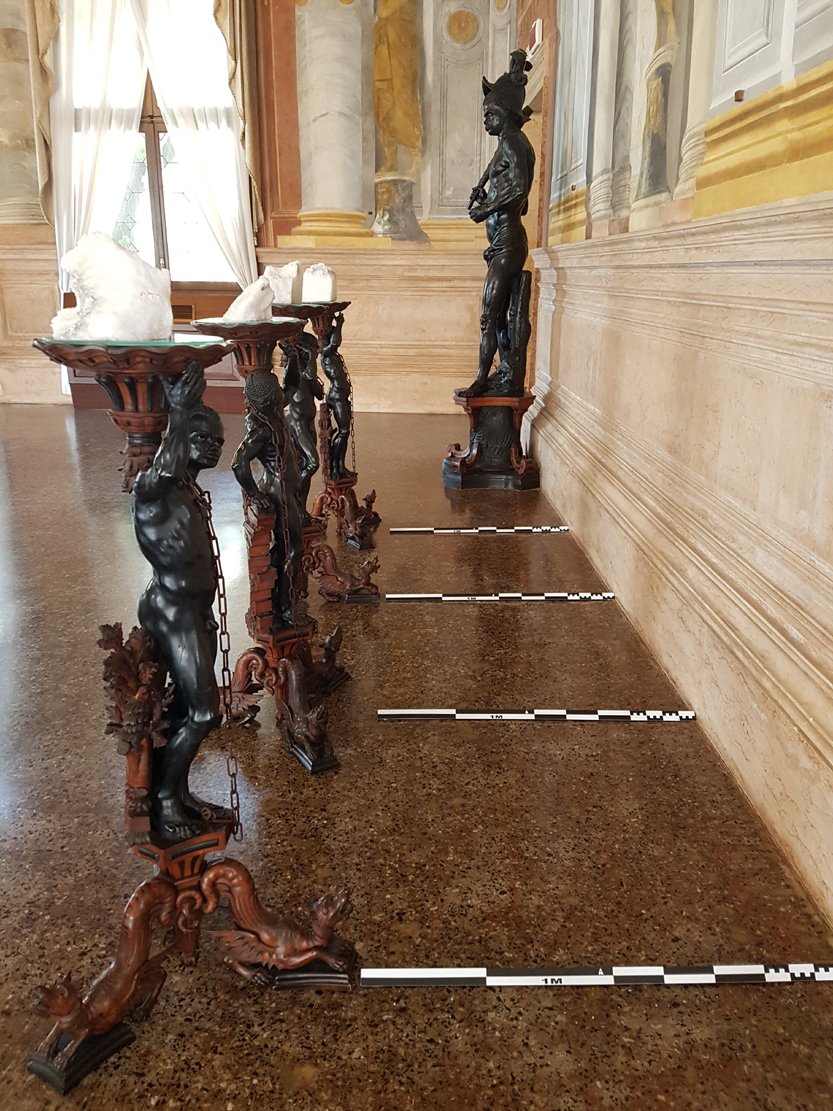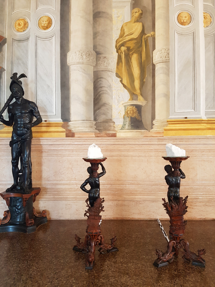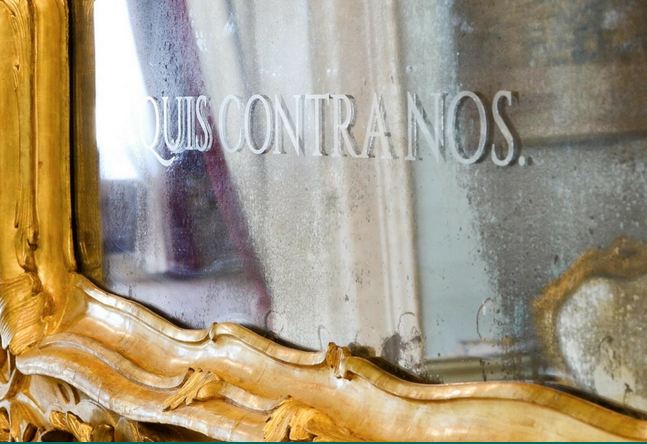 La dama dalla veste bianca, rappresentata sullo sfondo del dipinto del Longhi, indossa una maschera dell’epoca, a uso unicamente femminile, detta Moréta: un ovale nero con due buchi in corrispondenza degli occhi. Le donne potevano fermarla sul viso soltanto mordendo un pomolo all’altezza della bocca, rimanendo costrette, in questo modo, a tacere. L’artista estrapola dal dipinto la maschera e la colloca al centro del boudoir, in modo che sia rivelata al pubblico e che possa essere vista in tutta la sua interezza, compreso il retro. L’installazione Quis contra nos prende avvio dallo stemma della famiglia Rezzonico, presente in diversi ambienti del palazzo e che riporta la scritta in lettere dorate Si Deus pro nobis. Nel corso della storia queste parole sono state utilizzate in molte occasioni e strumentalizzate per giustificare atti criminali, guerre e stermini di massa da grandi dittatori e uomini di potere. La frase è tratta da San Paolo (Lettera ai Romani, 8, 31) e nella sua forma originale recita: Si Deus pro nobis, quis contra nos. (Se Dio è con noi, chi sarà contro di noi?). La parte omessa del motto è rivelata dall’azione di Marzia Migliora per andare a collocarsi sugli specchi della collezione del palazzo nelle sale degli Arazzi, del Trono, del Tiepolo e Lazzarini. Dal corpus scultoreo degli Etiopi portavaso di Andrea Brustolon e dall’affresco di Gian Domenico Tiepolo Mondo Novo nasce l’omonima installazione di Marzia Migliora situata nel salone al primo piano e nella sala del Brustolon.