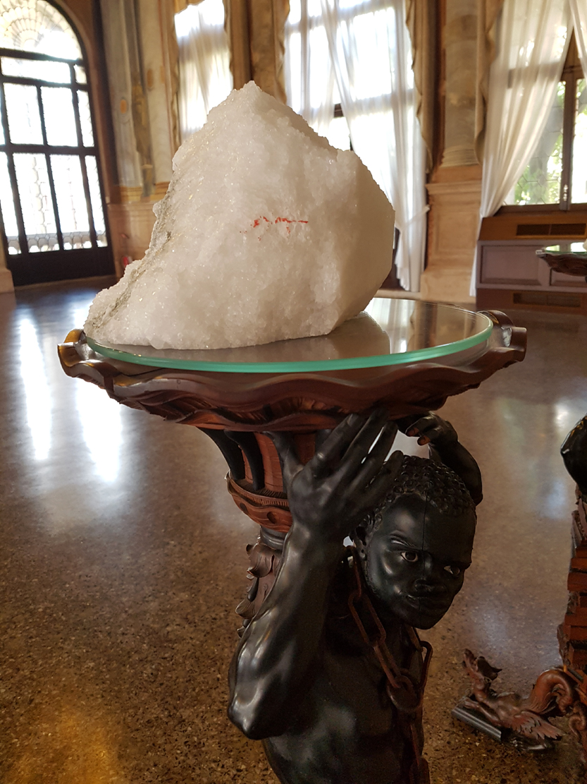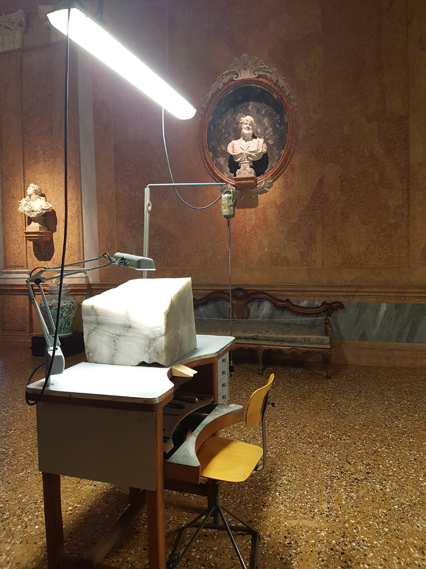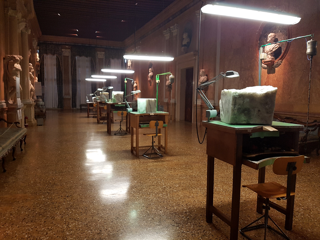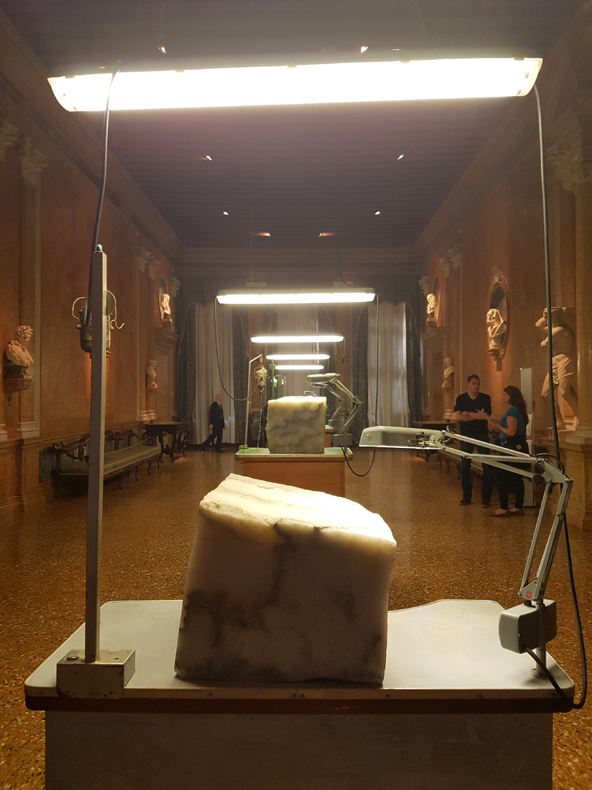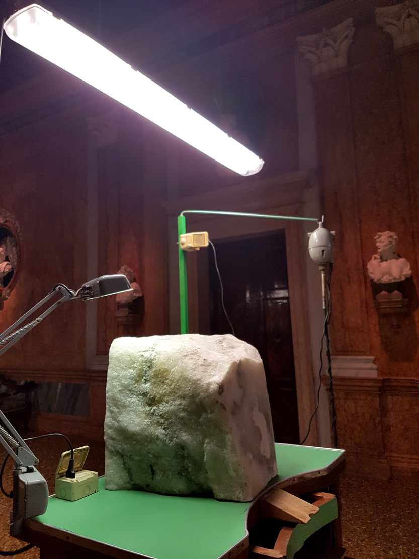 La mostra – curata da Beatrice Merz – comprende 5 installazioni collocate in differenti ambienti del Palazzo e scelti accuratamente dall’artista. Nel portego de mezo – luogo caratteristico dei palazzi veneziani che coniuga la porta d’acqua con quella di terra – è sita l’opera La fabbrica illuminata: 5 banchi da orafo, illuminati da una fila di neon e sui quali, per ciascun ripiano superiore, è posto un blocco di salgemma. Completa, e ispira il titolo del lavoro, il brano La fabbrica illuminata composta nel 1964 da Luigi Nono e dedicata agli operai della Italsider di Genova-Cornigliano. L’installazione e gli elementi che la compongono – il sale, così fondamentale nella storia commerciale di Venezia, denominato anche “oro bianco” e i banchi da orafo – ci rimandano allo sfruttamento delle risorse naturali e della forza lavoro necessaria alla trasformazione delle stesse in merce e in guadagno. Il capolavoro di Pietro Longhi Il Rinoceronte diventa citazione e rivelazione per l’installazione Taci, anzi parla.