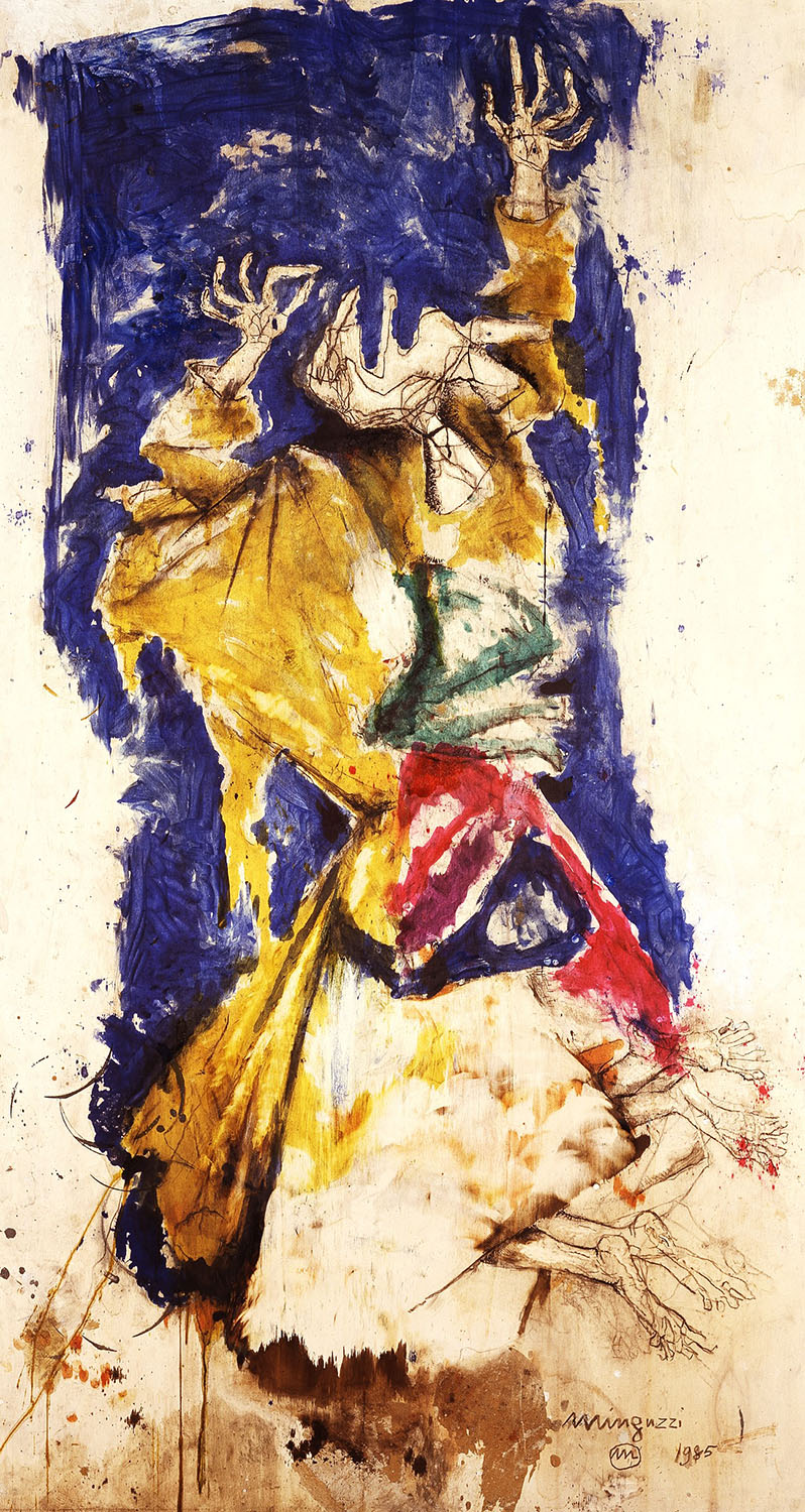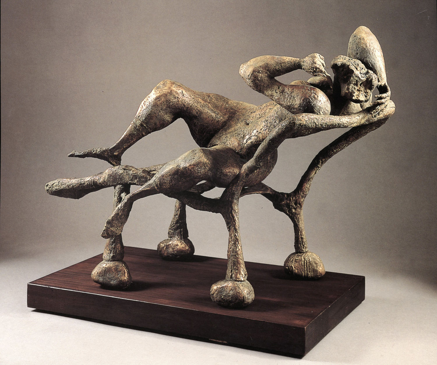 Lo stesso “espressionismo narrativo”, che mai prescinde da una componente grottesca, si ritrova nel tema degli animali, come il fantastico Oronte (1970) e la Civetta in gabbia (1952), a cui tocca una condizione di prigionia, e certamente nella grandiosa Porta del Bene e del Male (1970-77), nata per San Petronio a Bologna e poi commissionata da Papa Montini per San Pietro in Vaticano. Le vicende religiose sono ancora una volta l’occasione per tracciare con ironia ed epos popolare momenti di profonda sacralità in cui il dramma del martirio o delle crocifissioni sono resi con quella gestualità violenta divenuta un segno di inequivocabile distinzione.