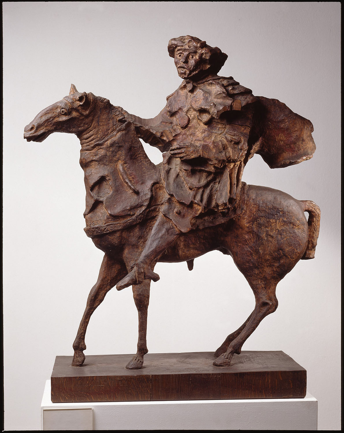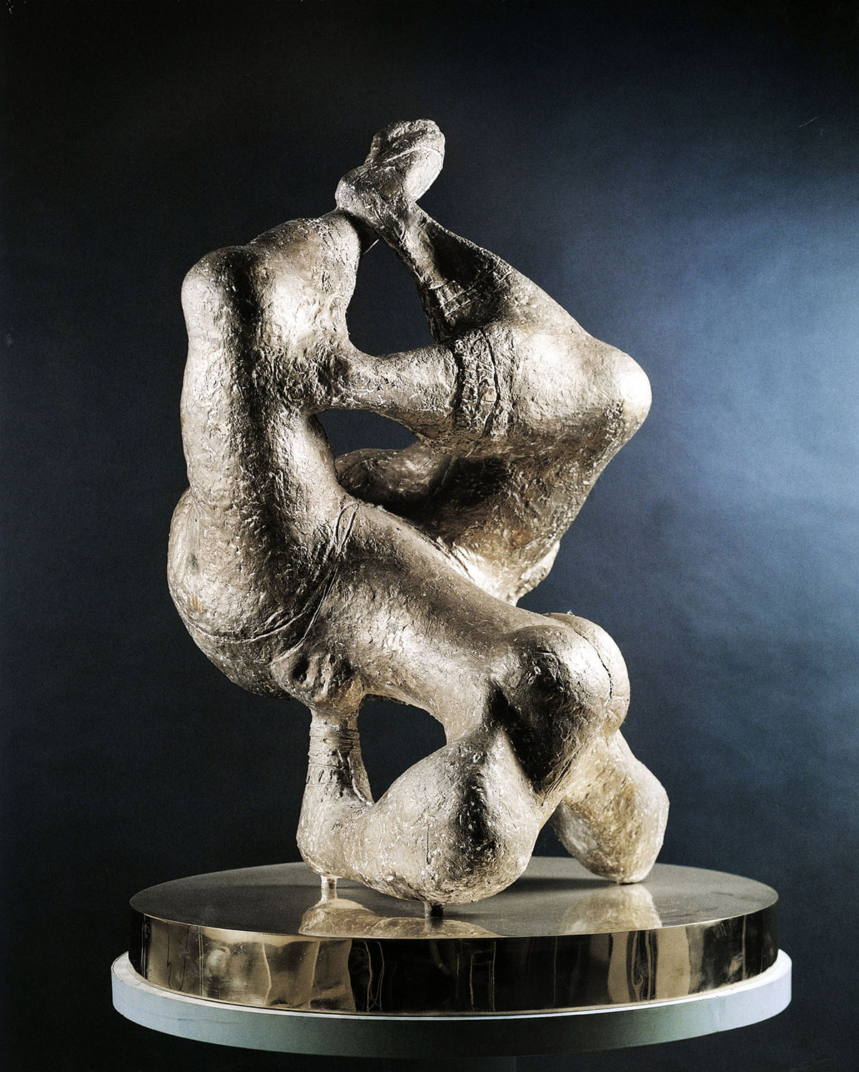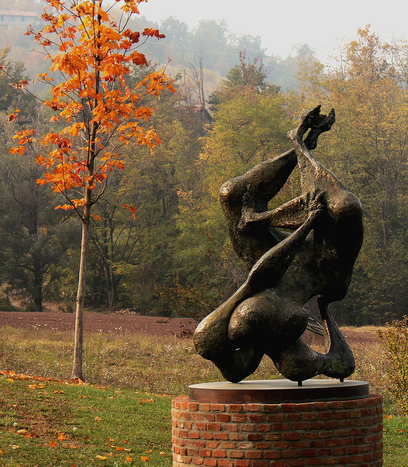 Ad accogliere il visitatore nel piazzale della Rocca, all’ingresso della mostra e in dialogo con la città, la monumentale Grande contorsionista (1952-89), di oltre due metri, tema molto amato dall’artista come quello degli Acrobati (1954) esposti nelle sale interne insieme a Donna al trapezio, legno policromo del 1956, Donna sul divano (1990), morbidamente distesa in posa plastica, e Op là, ultima creazione del 2000, evoluzione dinamica estrema degna del Giambologna o del Bernini che Minguzzi ha sempre ammirato, sfidando da par loro la materia.