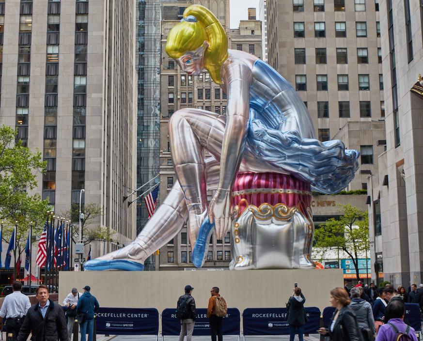 Dal 12 maggio al 2 giugno 2017 Jeff Koons torna per la terza volta al Rockfeller Center di New York con la prorompente opera Ballerina seduta, un’opera gonfiabile alta circa 15 metri che sembra metallo, in collaborazione con Art Production Fund and Kiehl’s.