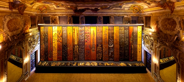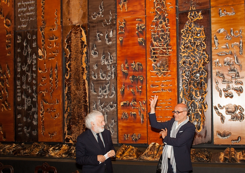 Cuore della mostra, l’installazione Fiamma inestinguibile (che dà il nome all’intero progetto), appositamente concepita per la sala principale di Palazzo Zenobio, e che si amalgama con gli affreschi dei quali riprende i colori scuri e l’aura monumentale. L’idea, suggestiva e poetica, ha un duplice aspetto: da un lato, quella della cultura come luce della civiltà, necessaria per misurare le caverne di platonica memoria. Ma dall’altro lato, con struggente intuitività, Boghossian rimanda alla straordinaria forza che la cultura ha dimostrata nei secoli, resistendo a terribile persecuzioni. Persecuzioni che non hanno risparmiato il popolo armeno, costantemente minacciato nei secoli dai califfati islamici prima e dagli Ottomani poi, fino alla dittatura sovietica. Grandi steli monumentali si dipartono da grossi libri bruciati, posti alla base di ognuna: metafora del sapere che dalla fragile carta s’irradia e mette robuste radici fra gli individui. Ognuna delle steli è decorata con motivi che ricordano le scritture orientali antiche, da quella armena a quella araba, dalla siriana all’egiziana, poiché è la scrittura il mezzo fondamentale per tramandare il sapere. Da un punto di vista leggermente diverso, Boghossian suggerisce l’idea della cultura che risorge dalle proprie ceneri come un’araba fenice: è accaduto in Armenia, dopo le distruzioni delle orde musulmane, così come dopo il genocidio del 1915, e settant’anni di Socialismo Reale. Ma è accaduto anche nel resto d’Europa, dalla censura dell’Inquisizione fino ai roghi dei libri “deviati” organizzati nella Germania nazista.